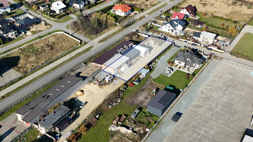 Działka o powierzchni ~ 1537 m², Teren równy, idealny pod inwestycję, wymiary: ok. 22 x 70 m, Hala magazynowa ~ 200 m², Budynek magazynowy jednokondygnacyjny, murowany, dach płaski metalowy, kryty blachą trapezową,Powierzchnia zabudowy: 200 m², użytkowa: 182,90 m², kubatura: 914,50 m³,Wymiary: 20 x 10 m, wysokość: 6,36 m,Ściany z pustaka ceramicznego gr. 29 cm, warstwa izolacyjna, murowane na zaprawie cementowo-wapiennej, Wiata magazynowa ~ 150 m², Stan techniczny: bardzo dobry, obiekt gotowy do natychmiastowego użytkowania,