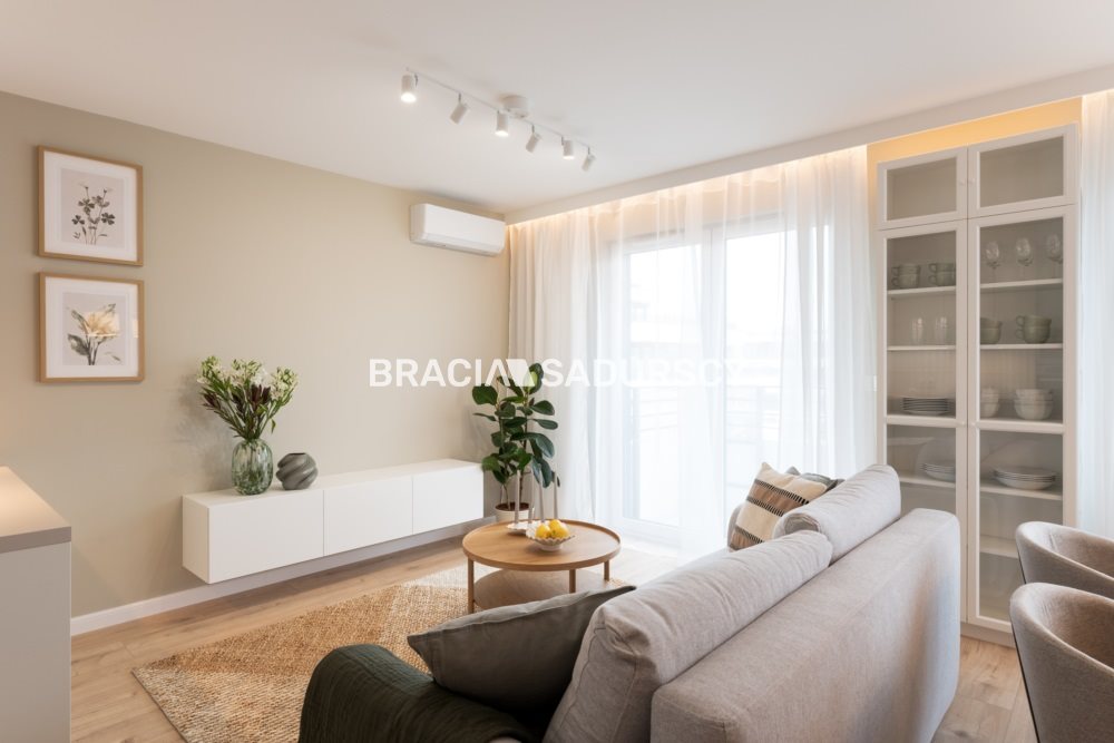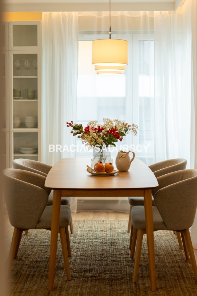 W salonie jest wygodna kanapa, szafka telewizyjna, witryna na porcelanę, stół oraz krzesła. Przestronna kuchnia z dodatkową wyspą zapewnia komfortową przestrzeń do gotowania i magazynowania. Jest wyposażona w cały niezbędny sprzęt AGD tj. płyta indukcyjna, piekarnik, zmywarka, lodówka oraz okap. Mieszkanie z klimatyzacją.