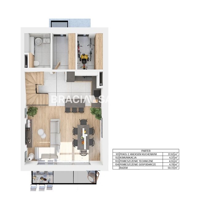 Parter - salon z kuchnią, łazienka, kotłownia, pom. techniczne