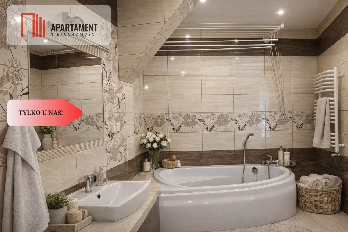 duża łazienka z wanną, podzielona na funkcjonalne strefy