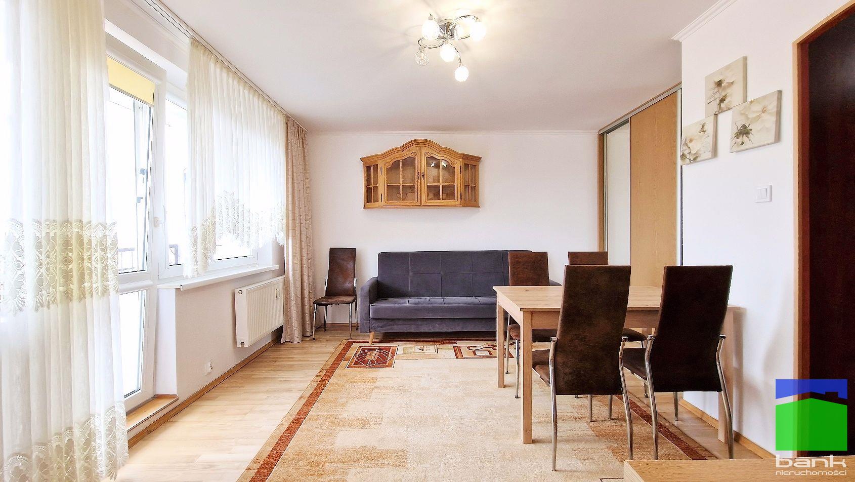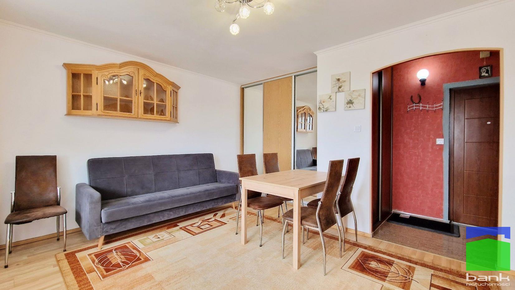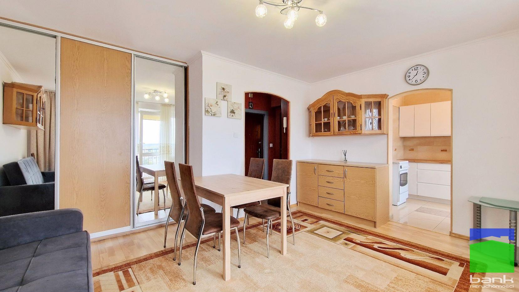 Pokój dzienny z balkonem <b>(loggia)</b> na stronę wschodnią i wejściem do kuchni. W pokoju rozkładana sofa, lustrzana szafa w zabudowie oraz meble widoczne na zdjęciach. Łazienka z kabiną prysznicową (pralka na wyposażeniu). Przedpokój z szafą w zabudowie.