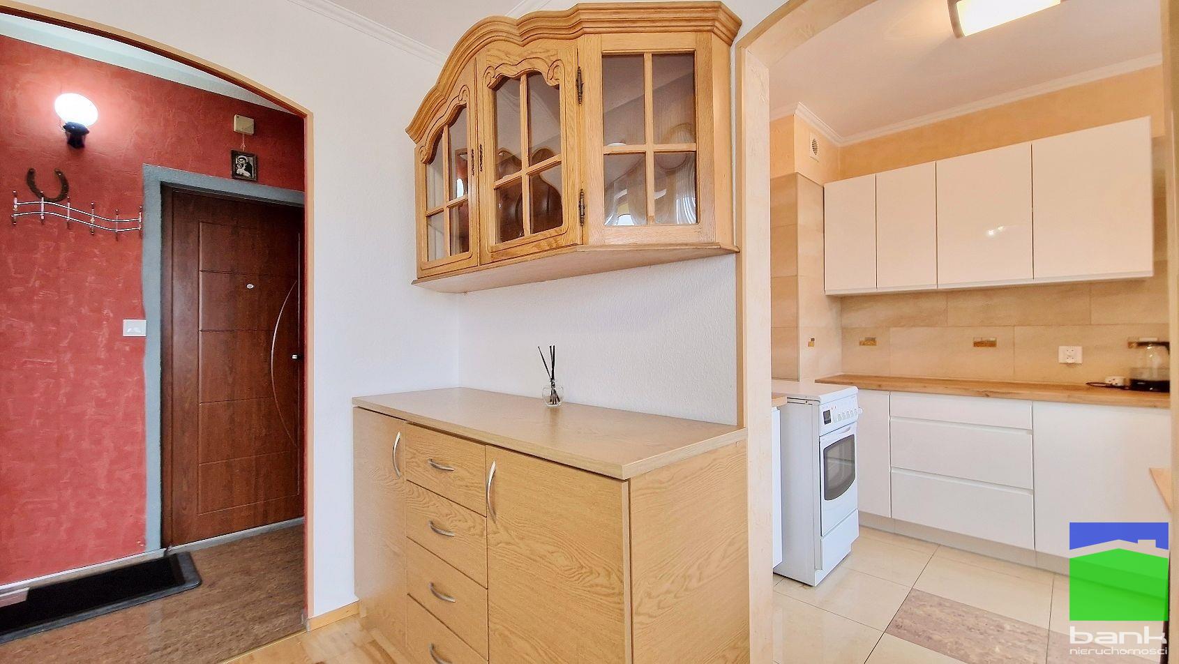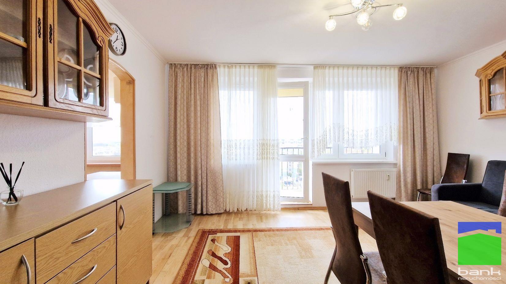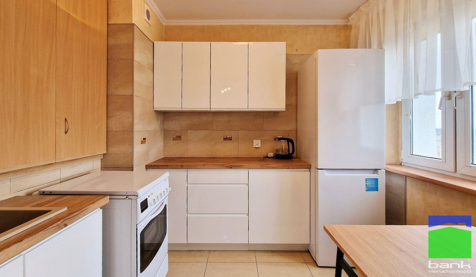 Pokój dzienny z balkonem <b>(loggia)</b> na stronę wschodnią i wejściem do kuchni. W pokoju rozkładana sofa, lustrzana szafa w zabudowie oraz meble widoczne na zdjęciach. Łazienka z kabiną prysznicową (pralka na wyposażeniu). Przedpokój z szafą w zabudowie.