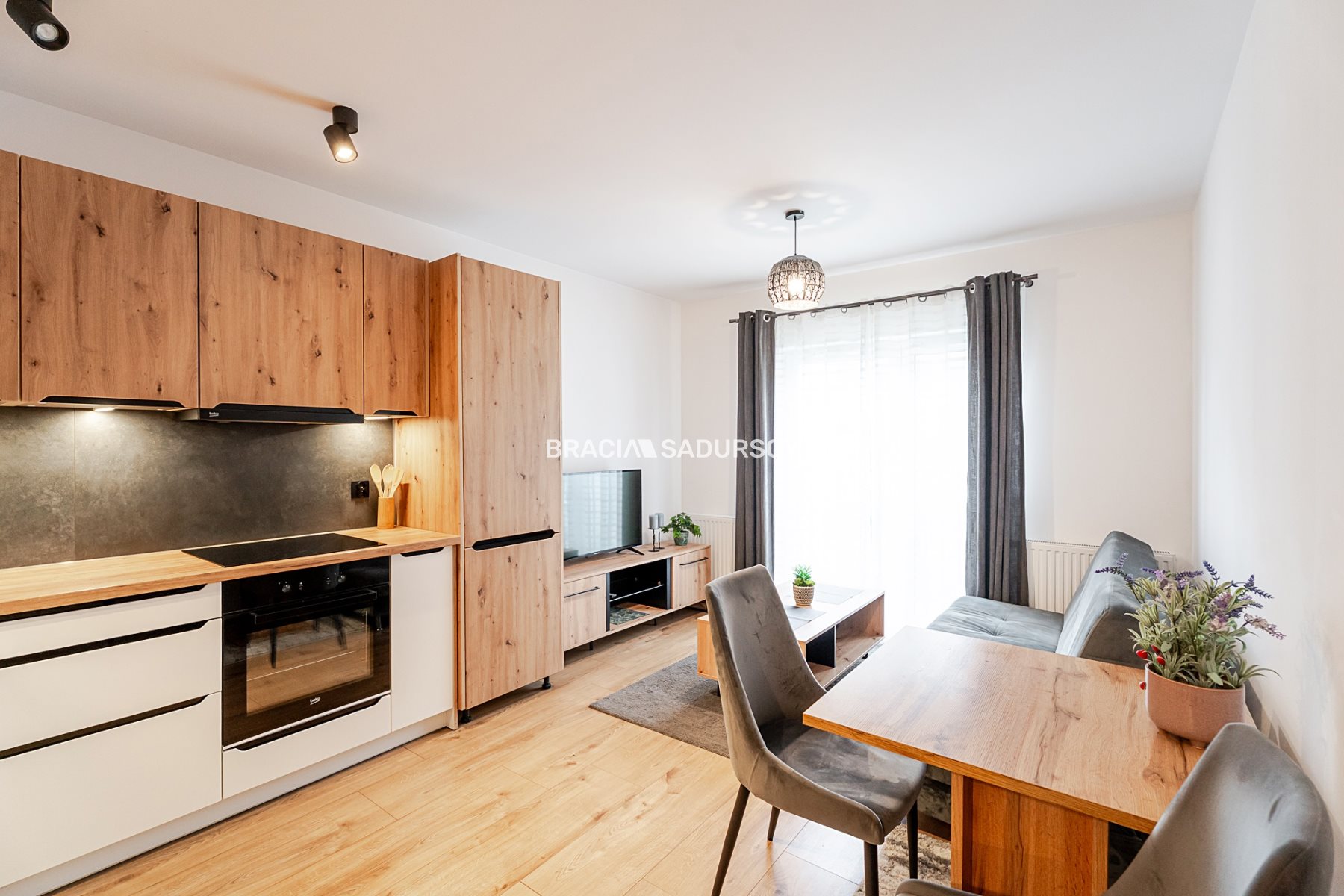 przestronnego umeblowanego salonu z nowoczesną zabudową kuchenną oraz balkonem francuskim,