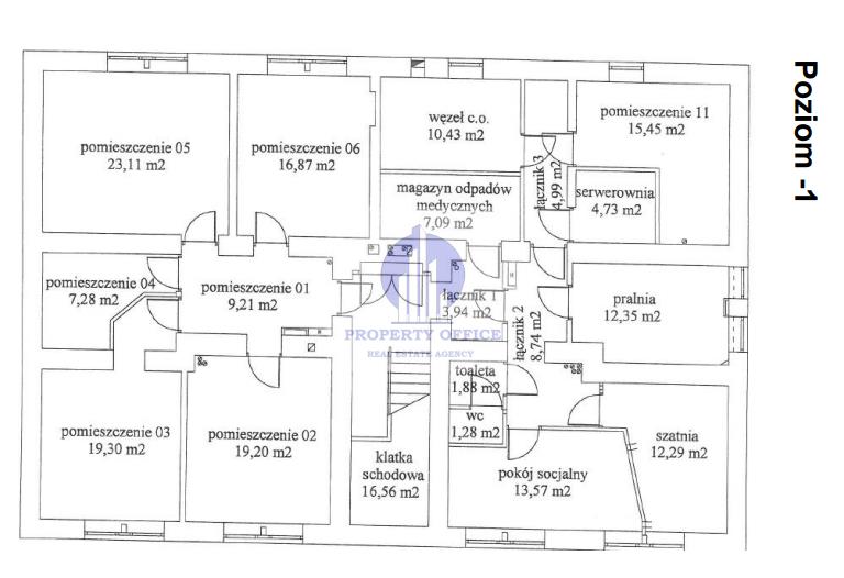 -Poziom -1: 197,84 m2 (pralnia, szatnia, magazyn odpadów medycznych, węzeł co, pokój socjalny, + 6 pomieszczeń z dostępem do światła dziennego),