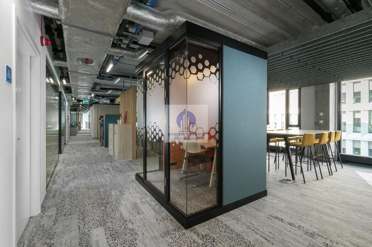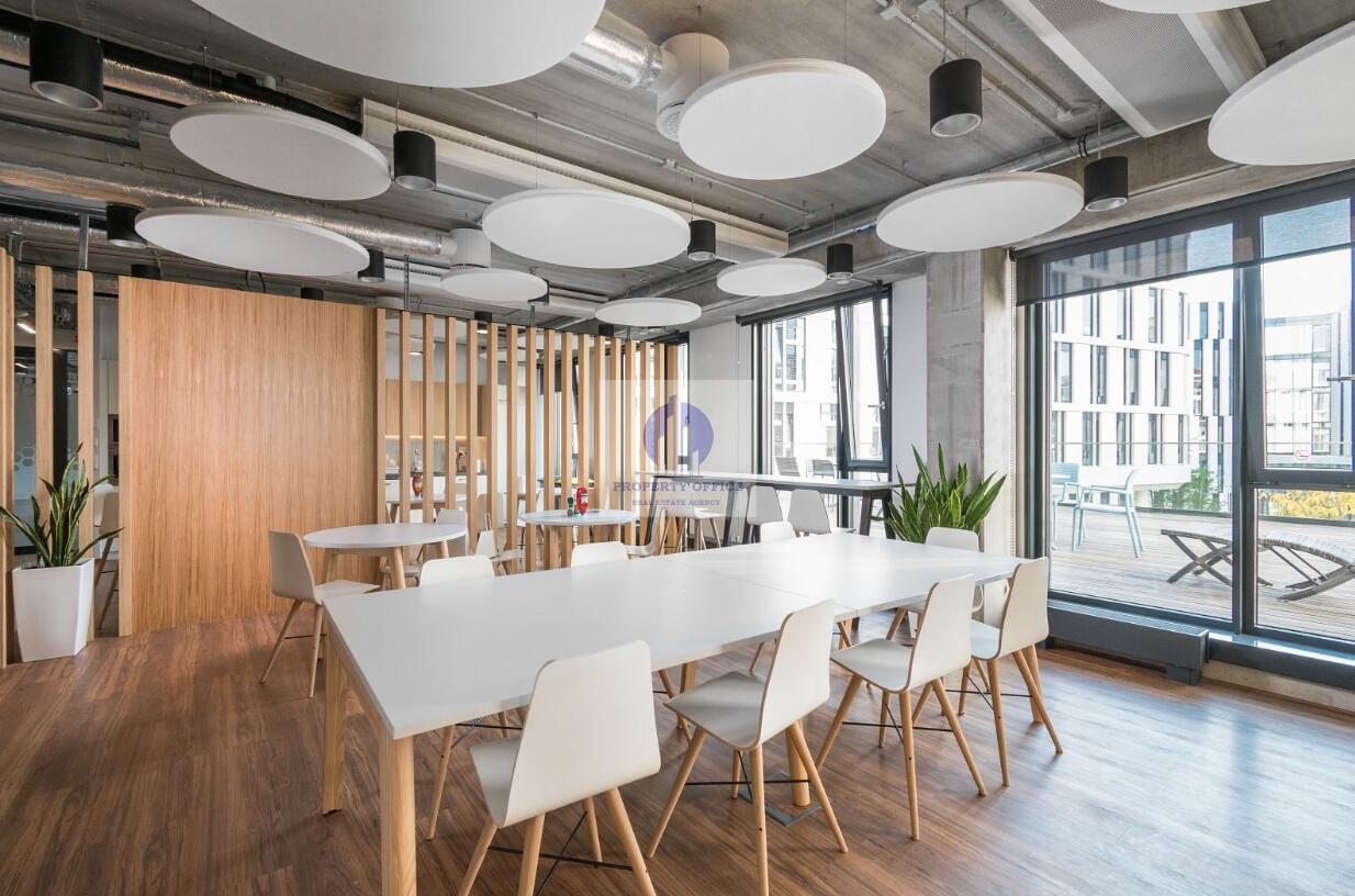 Podwieszany sufit w korytarzach, belki chłodzące, oświetlenie w części biurowej, uchylne okna, drzwi wejściowe, grzejniki, podniesiona podłoga, wyposażenie toalet, kontrola dostępu, 24h ochrona, BMS.