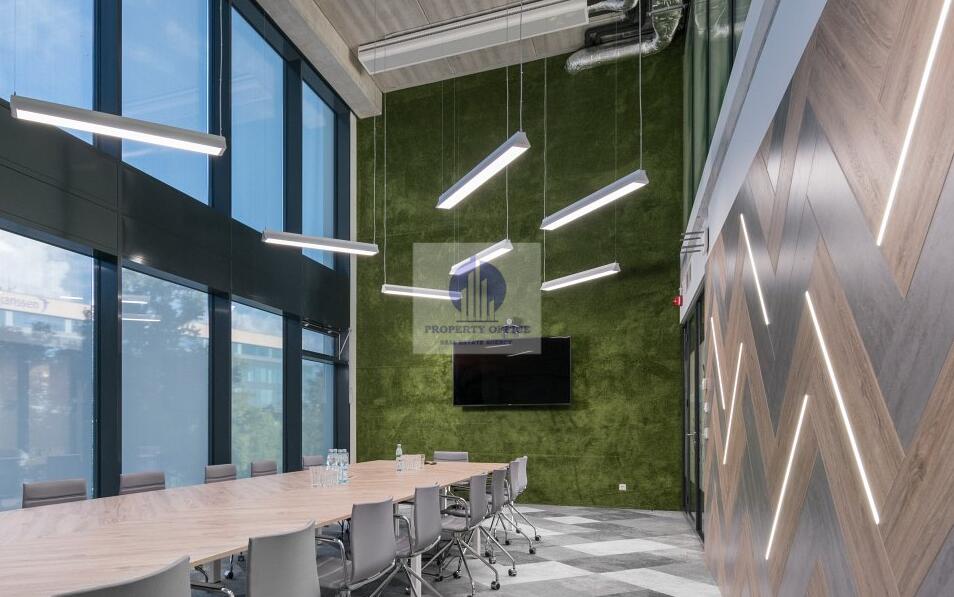 Podwieszany sufit w korytarzach, belki chłodzące, oświetlenie w części biurowej, uchylne okna, drzwi wejściowe, grzejniki, podniesiona podłoga, wyposażenie toalet, kontrola dostępu, 24h ochrona, BMS.