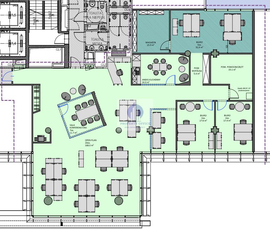 Wysokiej jakości powierzchnia biurowa z możliwością dowolnej aranżacji, zarówno na gabinety, jak i open space.