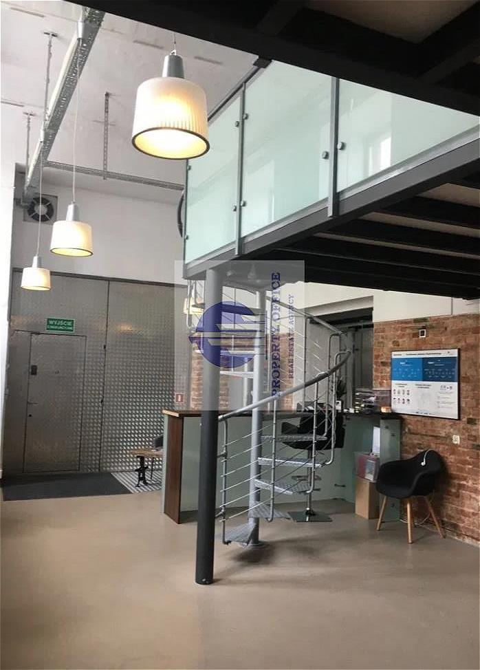 Jedno duże pomieszczenie z przestrzenią biurową zaaranżowaną na antresoli, na którą wiodą spiralne schody.
