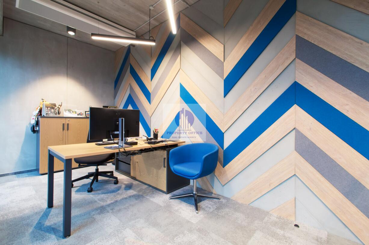 Podwieszany sufit w korytarzach, belki chłodzące, oświetlenie w części biurowej, uchylne okna, drzwi wejściowe, grzejniki, podniesiona podłoga, wyposażenie toalet, kontrola dostępu, 24h ochrona, BMS.