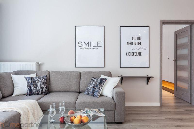 Salon kompletnie umeblowany, na podłodze panele, wygodny narożnik, stolik kawowy, TV na ścianie.