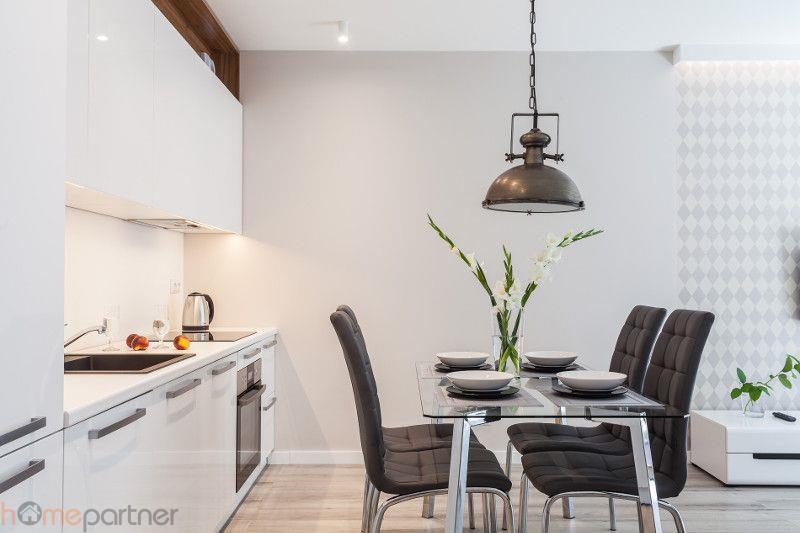 Kuchnia kompletnie umeblowana i wyposażona (zmywarka, lodówka, piekarnik, płyta, wyciąg, stół oraz 4 krzesła).