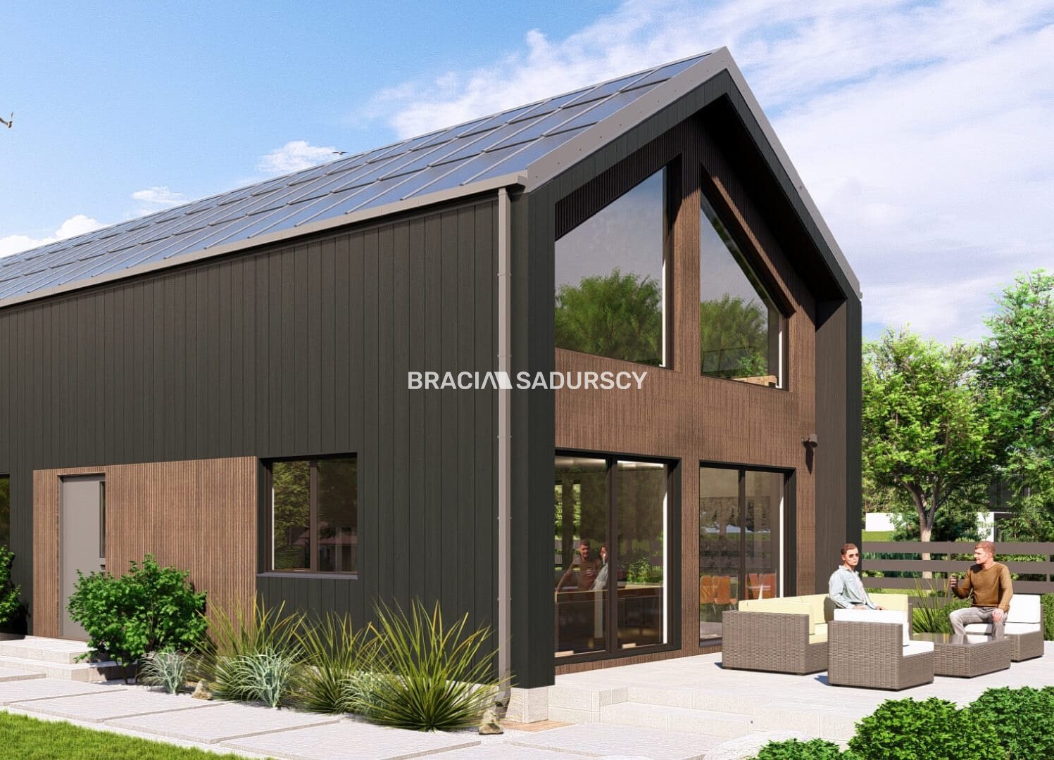 Dom o powierzchni 141,83 m² to idealne połączenie nowoczesnego designu i funkcjonalności. Inspirowany koncepcją nowoczesnej stodoły, ten energooszczędny projekt przyciąga uwagę dużymi przeszkleniami frontowymi, które wypełniają wnętrze naturalnym światłem i tworzą atmosferę otwartości i przestronności.