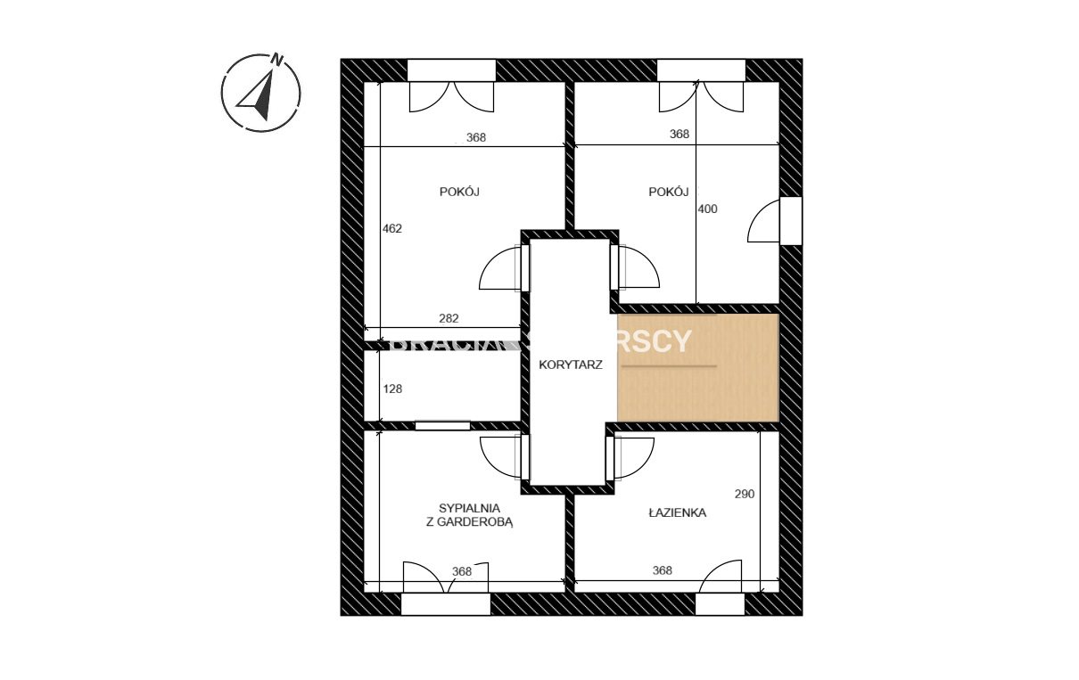 Na piętrze mieszczą się trzy ustawne sypialnie (bez skosów - strop żelbetowy) oraz duża łazienka z wydzielonym miejscem na pralkę i suszarkę. Cała przestrzeń jest jasna, funkcjonalna i łatwa do aranżacji. Dodatkowo dom posiada nieużytkowe, ocieplone poddasze z zamontowaną centralą wentylacyjną z rekuperacją.