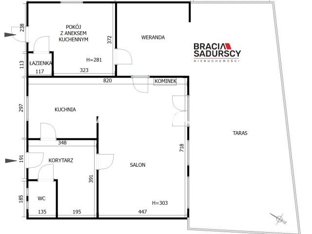 weranda z tarasem (łącznie 55 m2) - weranda zadaszona z dodatkowym kominkiem i wyjściem na przestronny taras. Istnieje możliwość przekształcenia werandy na dodatkowe pomieszczenie o powierzchni około 15 m2 (np. gabinet, salon kąpielowy z jacuzzi, dodatkową saunę z widokiem na las)