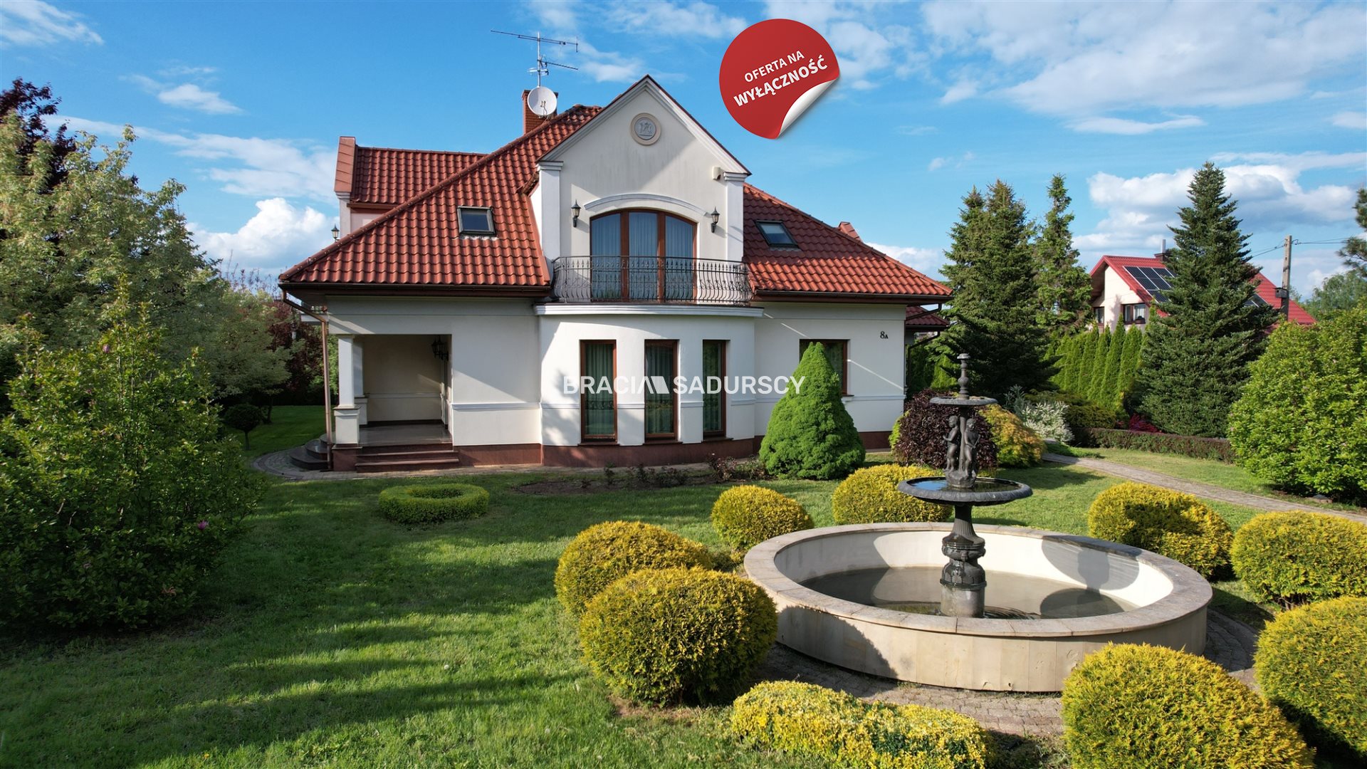 Przestronny, starannie wykończony dom o charakterze "dworkowym", jednorodzinny z możliwością podziału na dwurodzinny (z osobnym wejściem). Dom ukończony w 2008 r., zlokalizowany na spokojnym osiedlu domów jednorodzinnych. Wybudowany z pustaka ceramicznego (porotherm) grubości 44 cm, z tynkiem zewnętrznym ocieplającym (3-4 cm). Dach kryty dachówka ceramiczną, okna drewniane. Ogrzewanie centralne gazowe piecem dwufunkcyjnym, częściowo podłogowe, oraz dodatkowo kominek z nadmuchem na poddaszu. Odkurzacz centralny. Podłogi z naturalnego drewna oraz gresu, częściowo wykończenia drewnem egzotycznym (Merbau) i kamieniem naturalnym. Parapety zewnętrzne i taras z granitu. Garaż w bryle budynku, 2-stanowiskowy. Dom posiada saunę oraz profesjonalnie wyposażona siłownię. W łazience wanna z hydromasażem oraz prysznic z masażem. W ogrodzie system nawadniający i fontanna wykonana z mosiądzu. Całość ogrodzona. Woda z sieci miejskiej, kanalizacja miejska.