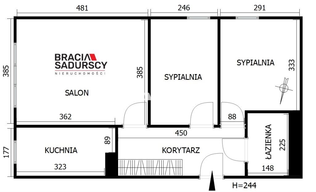 Składa się z trzech niezależnych pokoi (ok. 18,50 ; 10 ; 9,50 m2), oddzielnej, jasnej kuchni (ok. 6 m2), łazienki z wc (ok. 3,30 m2) oraz przedpokoju (ok. 8 m2) z dużą zabudowaną szafą.