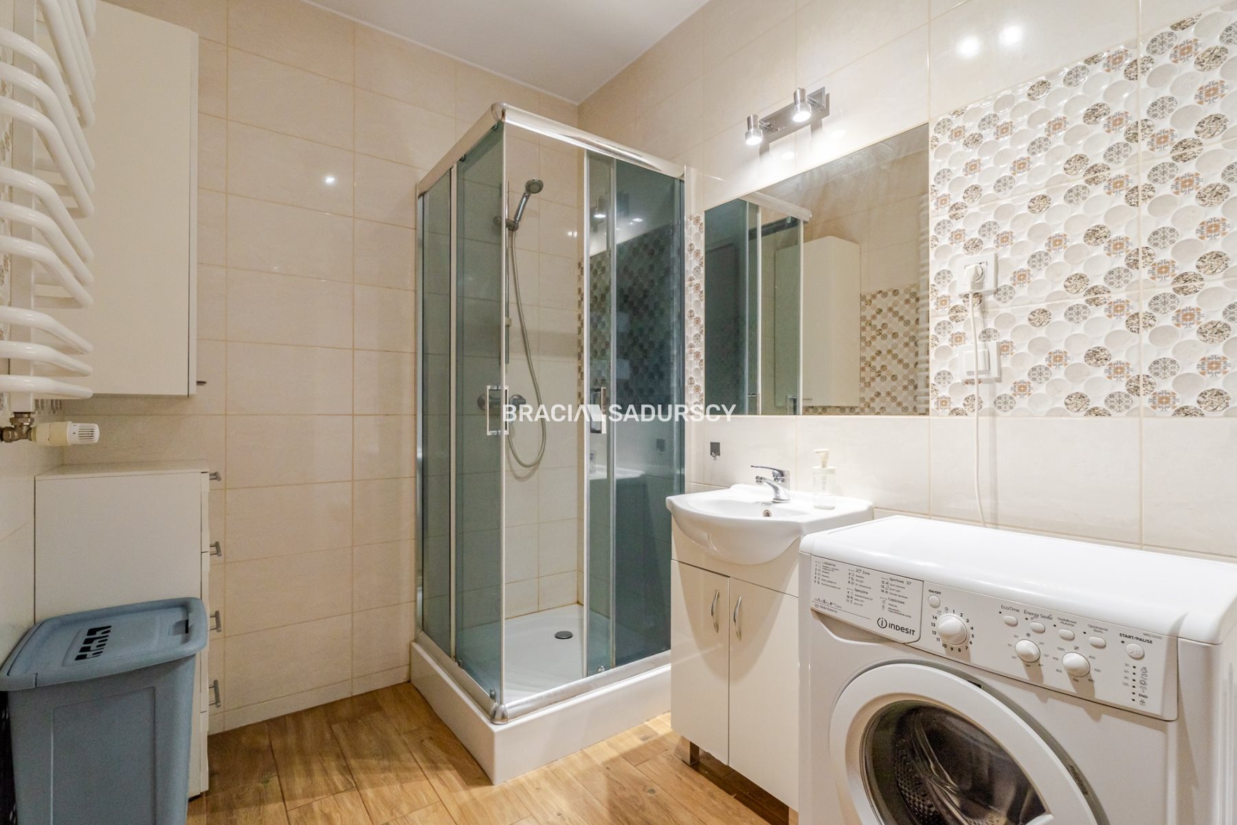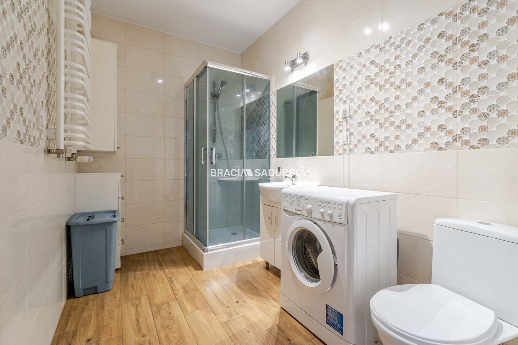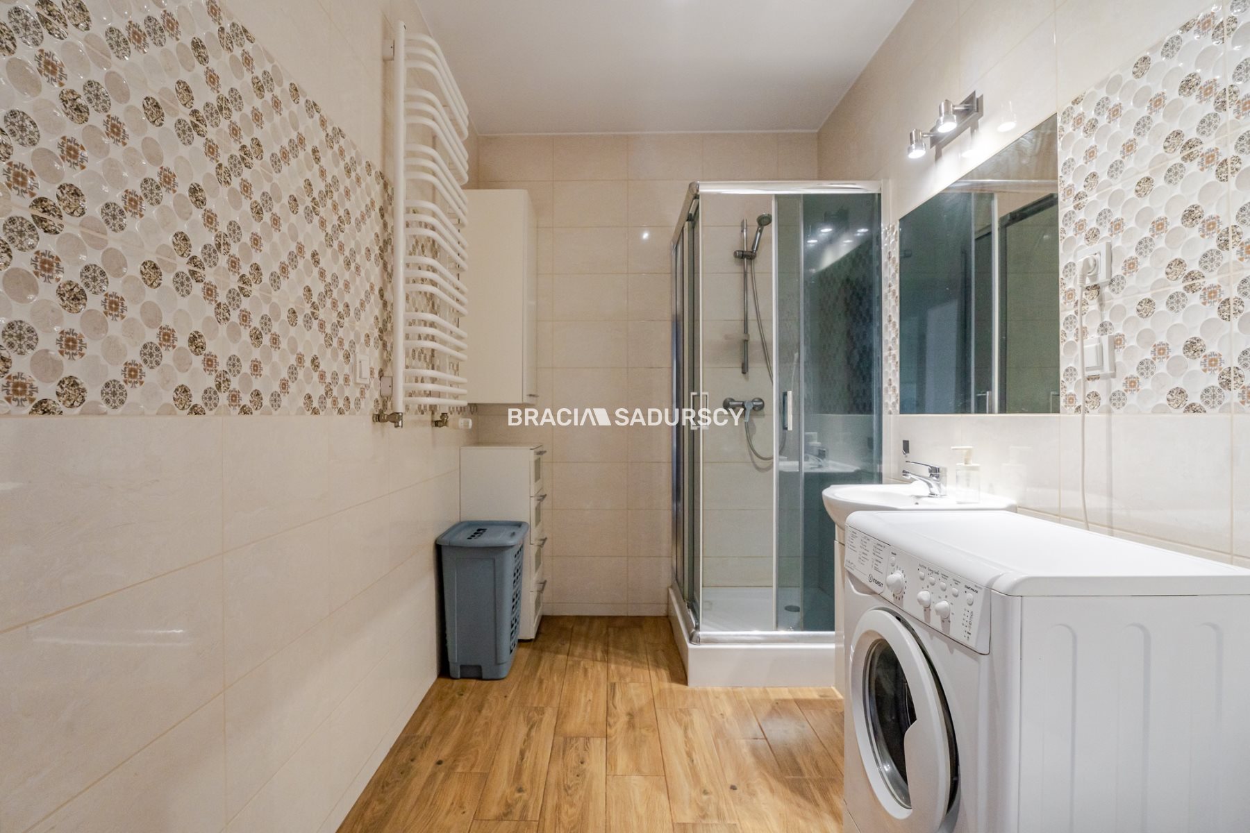 Łazienka duża, z kabiną prysznicową i pralką w ponadczasowej kolorystyce.