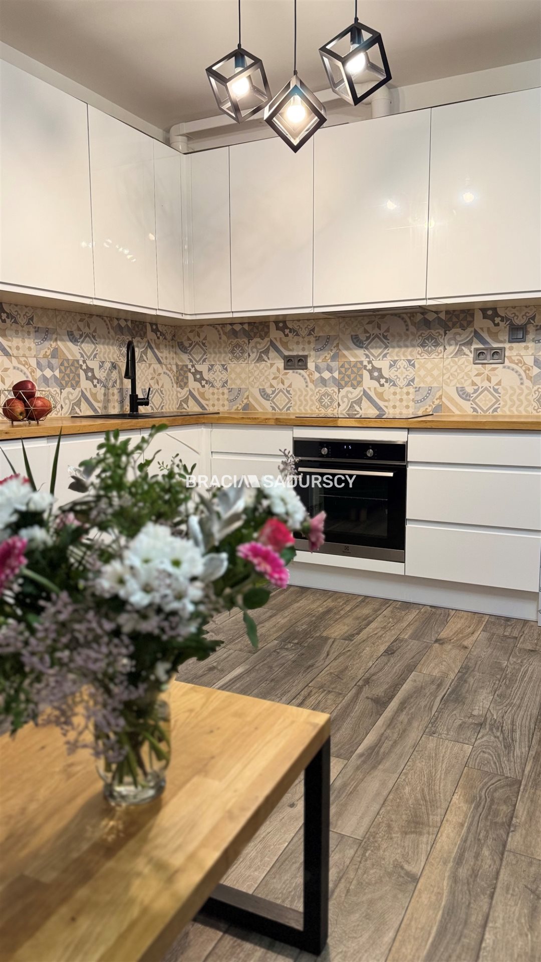 Salon z wygodną kanapą z funkcją spania, stolikiem, półką z litego drewna i ścianą wykończoną drewnem, z miejscem na TV. Kuchnia wyposażona w sprzęt AGD (zmywarka, piekarnik, okap, płyta, duża lodówka) oraz dębowy blat i gres imitujący drewno. Wszystko wygląda jak nowe.