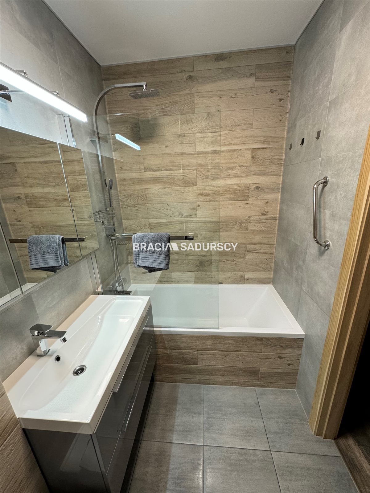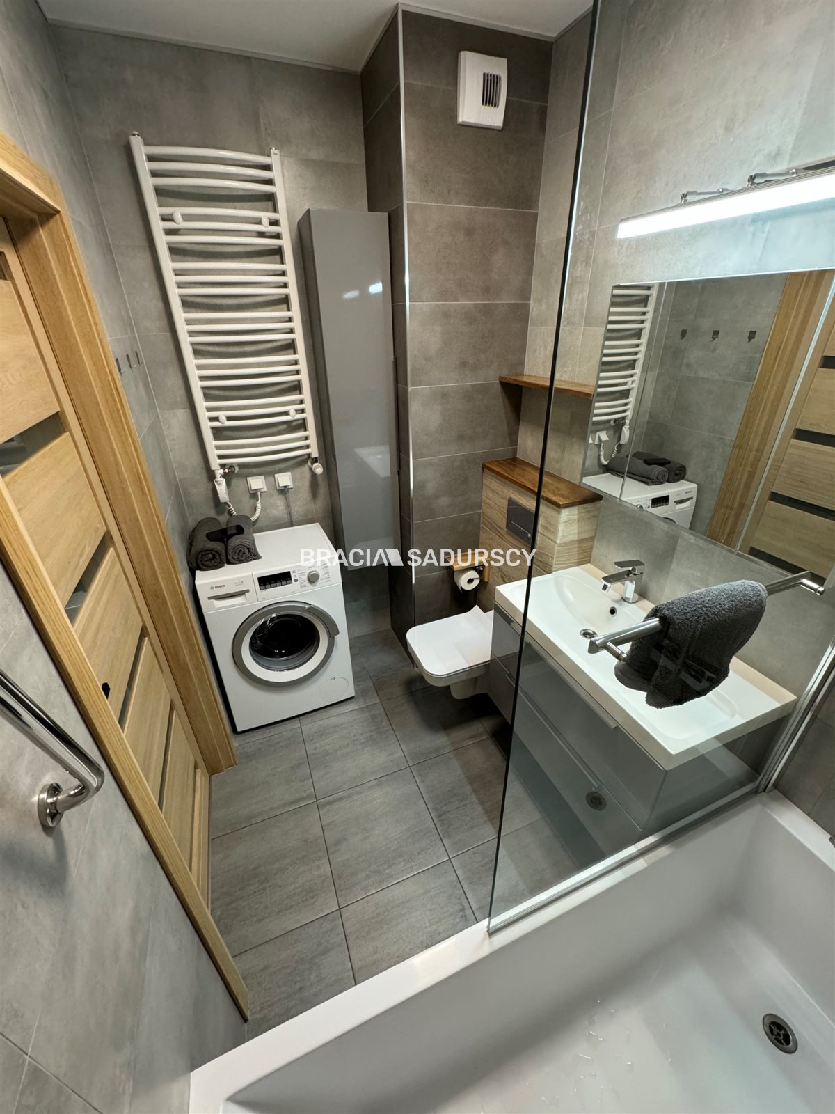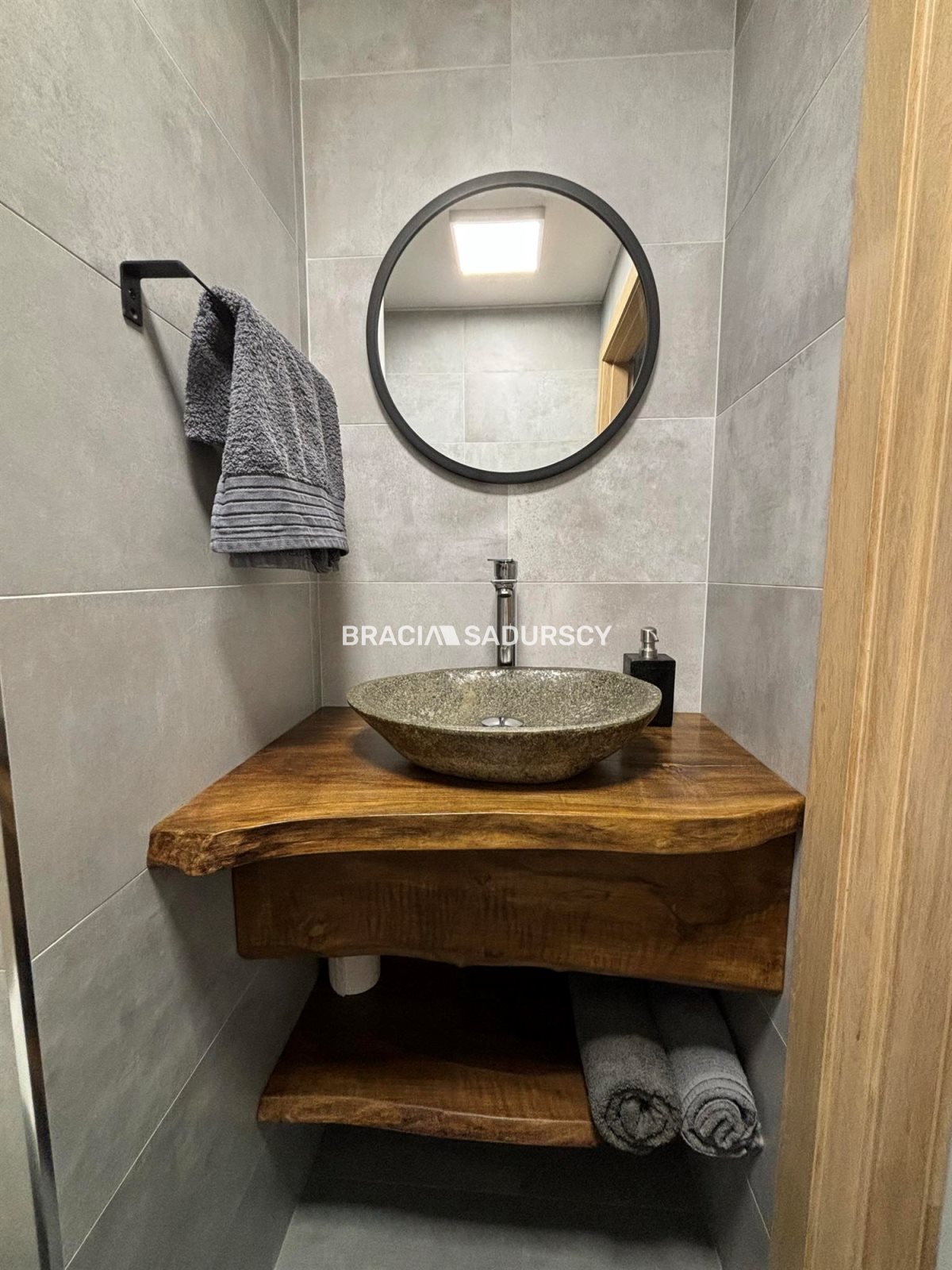 Łazienka z wanną/prysznicem, toaletą, szafkami i pralką. Osobne WC z toaletą, umywalką nablatową i szafkami. w obydwu pomieszczeniach blaty z orzecha włoskiego.