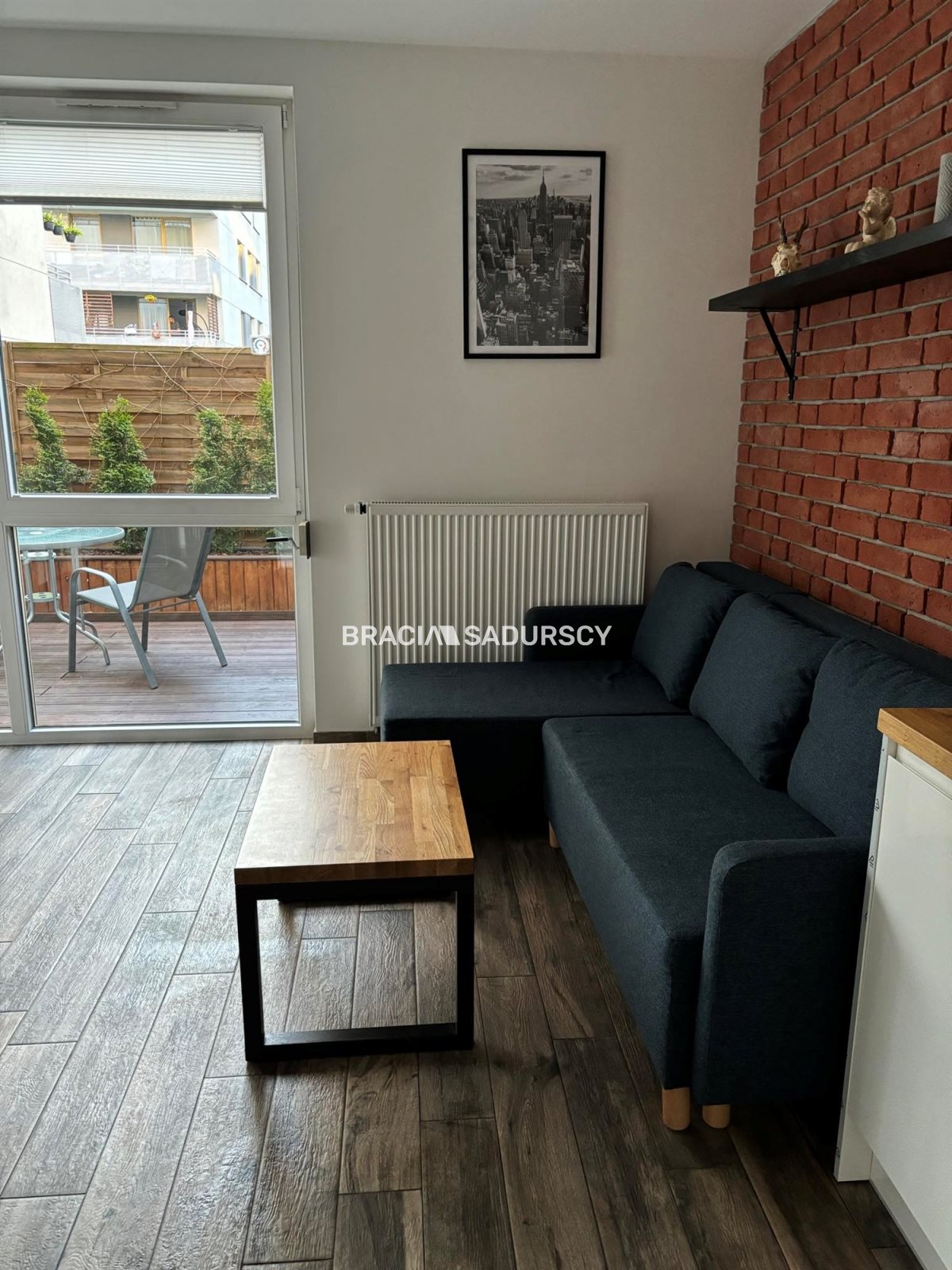 Salon z aneksem kuchennym - 16 m², wyjście do większego ogródka - 23 m², z tarasem i meblami ogrodowymi
