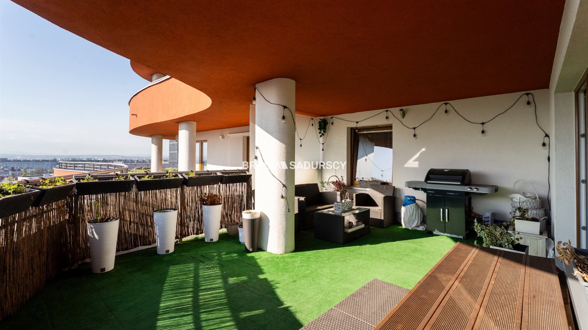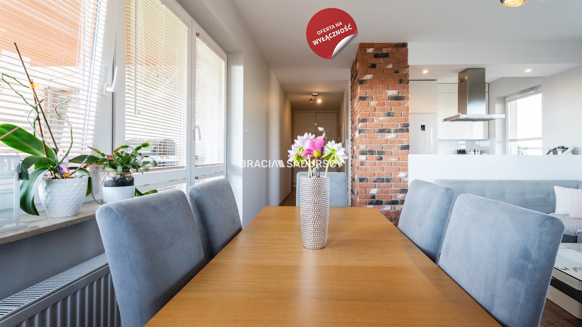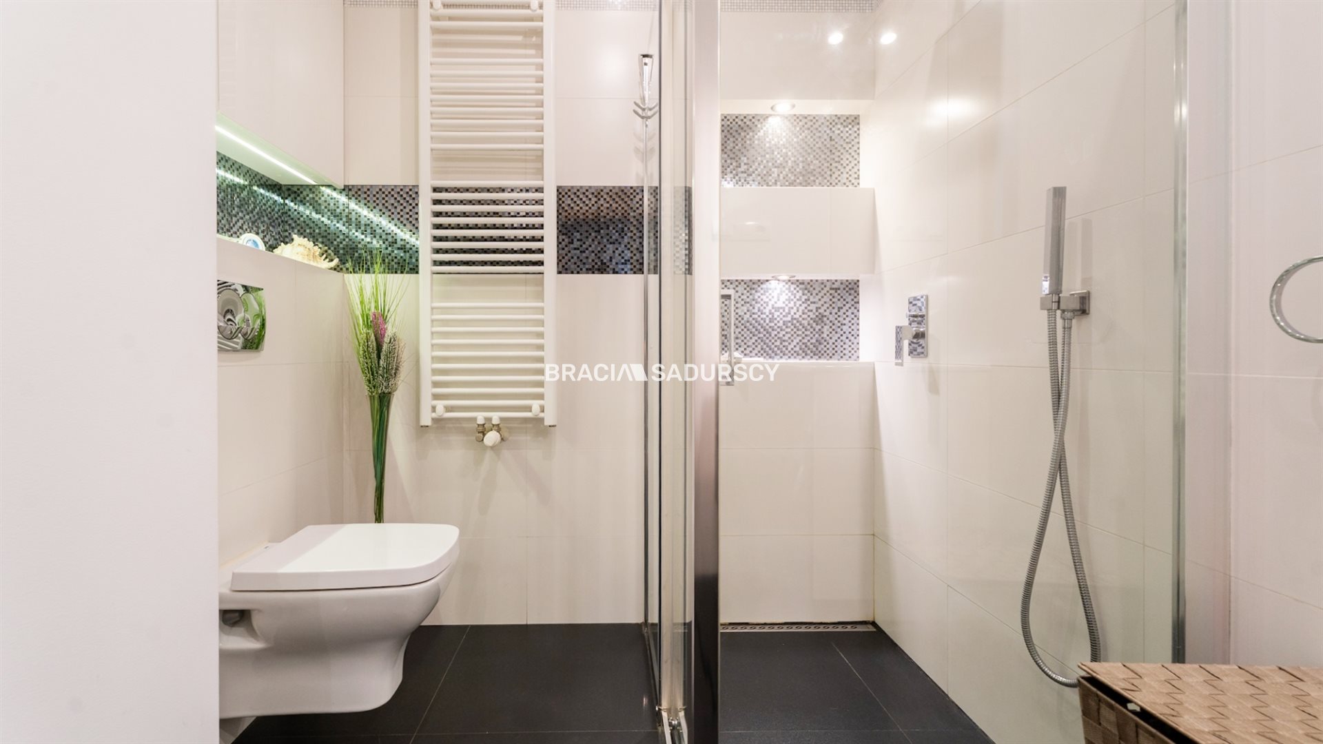Na klatce wyłącznie 2 mieszkania. Nieruchomość bardzo ładna, nowoczesna, wszystkie meble na wymiar od stolarza, zestaw wypoczynkowy na wymiar, parapety konglomeratowe, w oknach bambusowe żaluzje, drzwi tarasowe otwierane na przestrzał, oświetlenie tarasu tworzy atmosferę intymności i spokoju ponad dachami Krakowa. Remont przeprowadzony był rok temu, nieruchomość oddana do użytku w 2014.