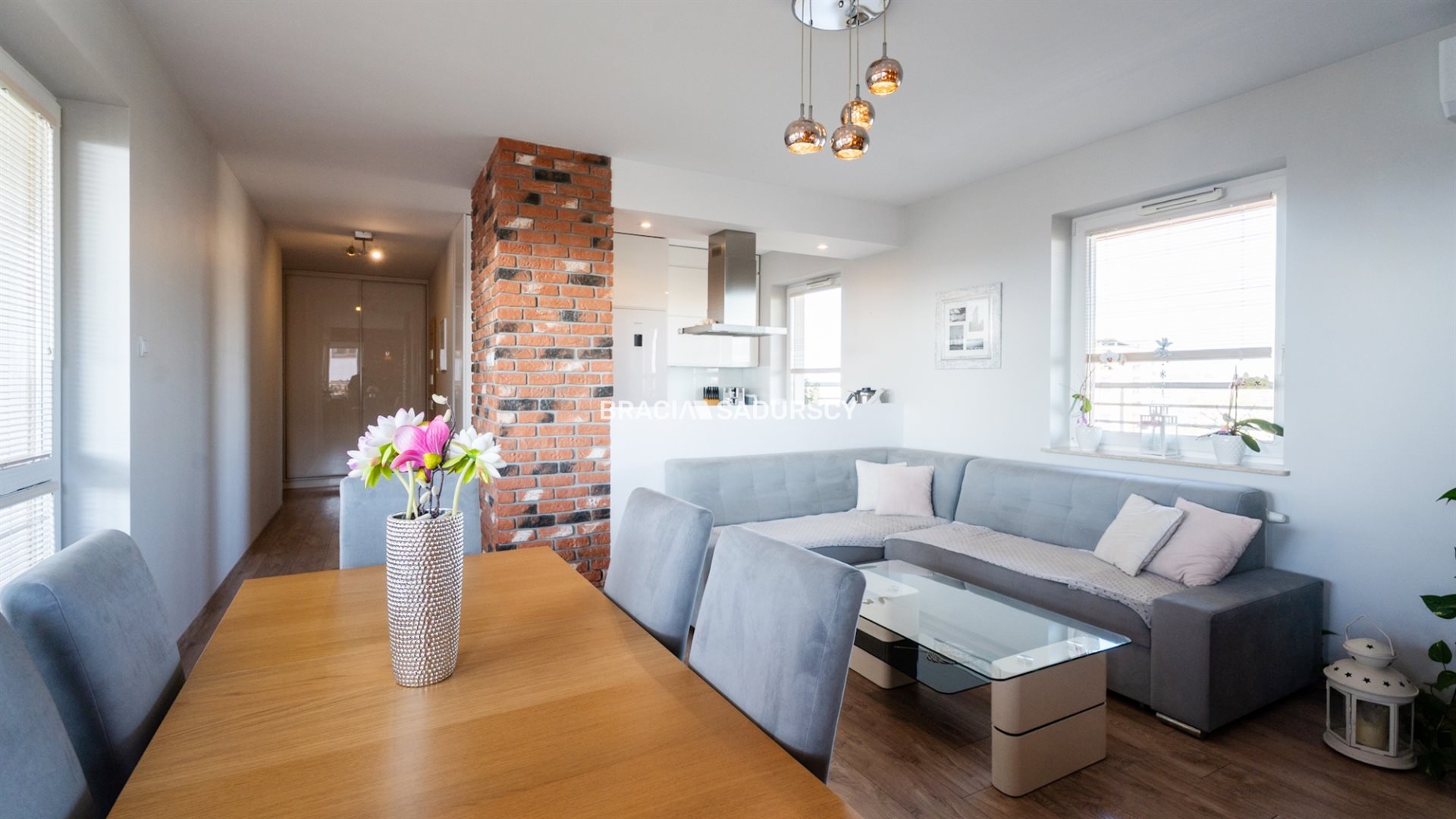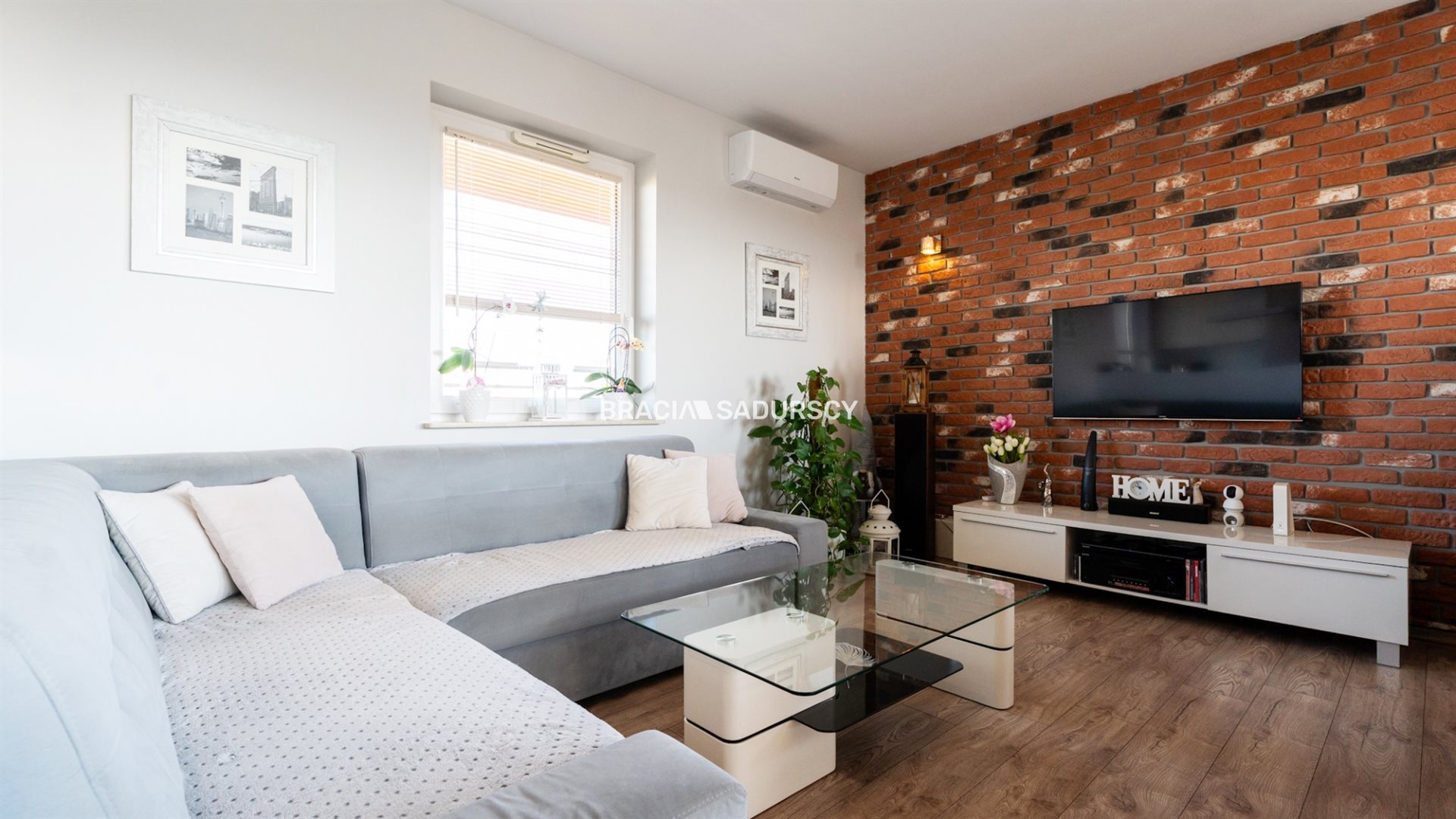 Mieszkanie jasne, słoneczne, w salonie klimatyzacja, na ścianach ozdobna cegła.