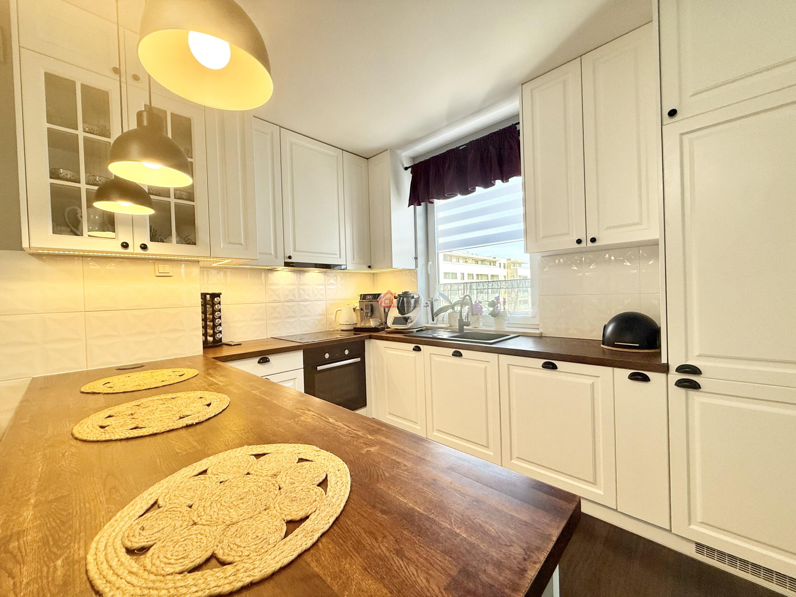 Aneks kuchenny, który jest funkcjonalnie zaprojektowany meble w zabudowie dębowe i wyposażony w nowoczesny sprzęt AGD. Mieszkanie posiada również duży balkon, gdzie można cieszyć się poranną kawą lub wieczornym relaksem na świeżym powietrzu.