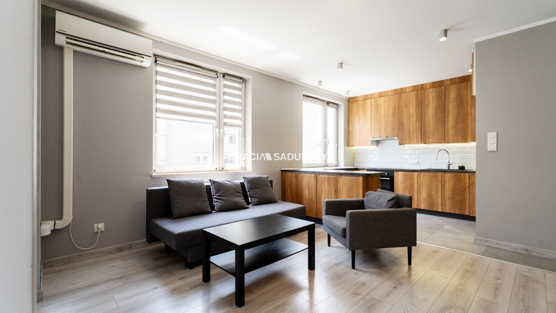 Na sprzedaż 2-pok. mieszkanie z klimatyzacją, miejscem postojowym w garażu podziemnym i komórka lokatorską o powierzchni 46,02 m2 według księgi wieczystej, jednak realnie to 46,38 m2 , ponieważ uwzględniono ściankę działową (0,12 x 3 m = 0,36 m2), która została usunięta przy wykończeniu lokalu, co optycznie powiększa przestrzeń dzienną.