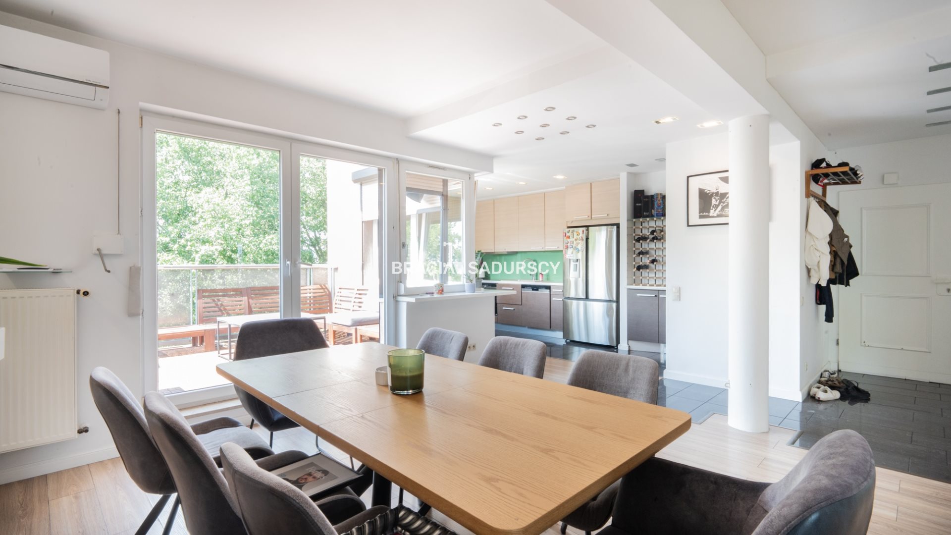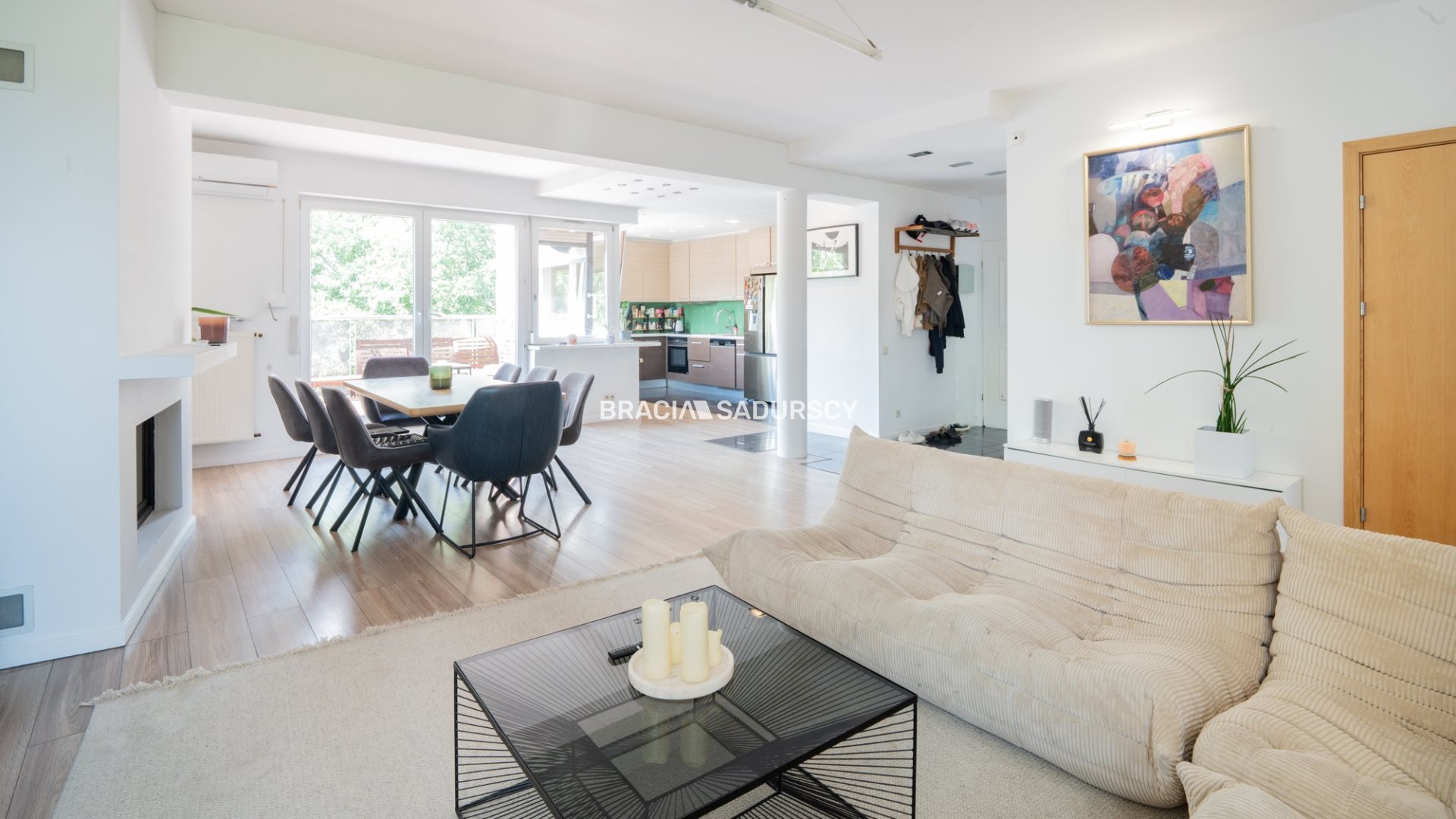 a spacious living room with access to a large terrace overlooking the Vistula River, combined with a fully equipped kitchen