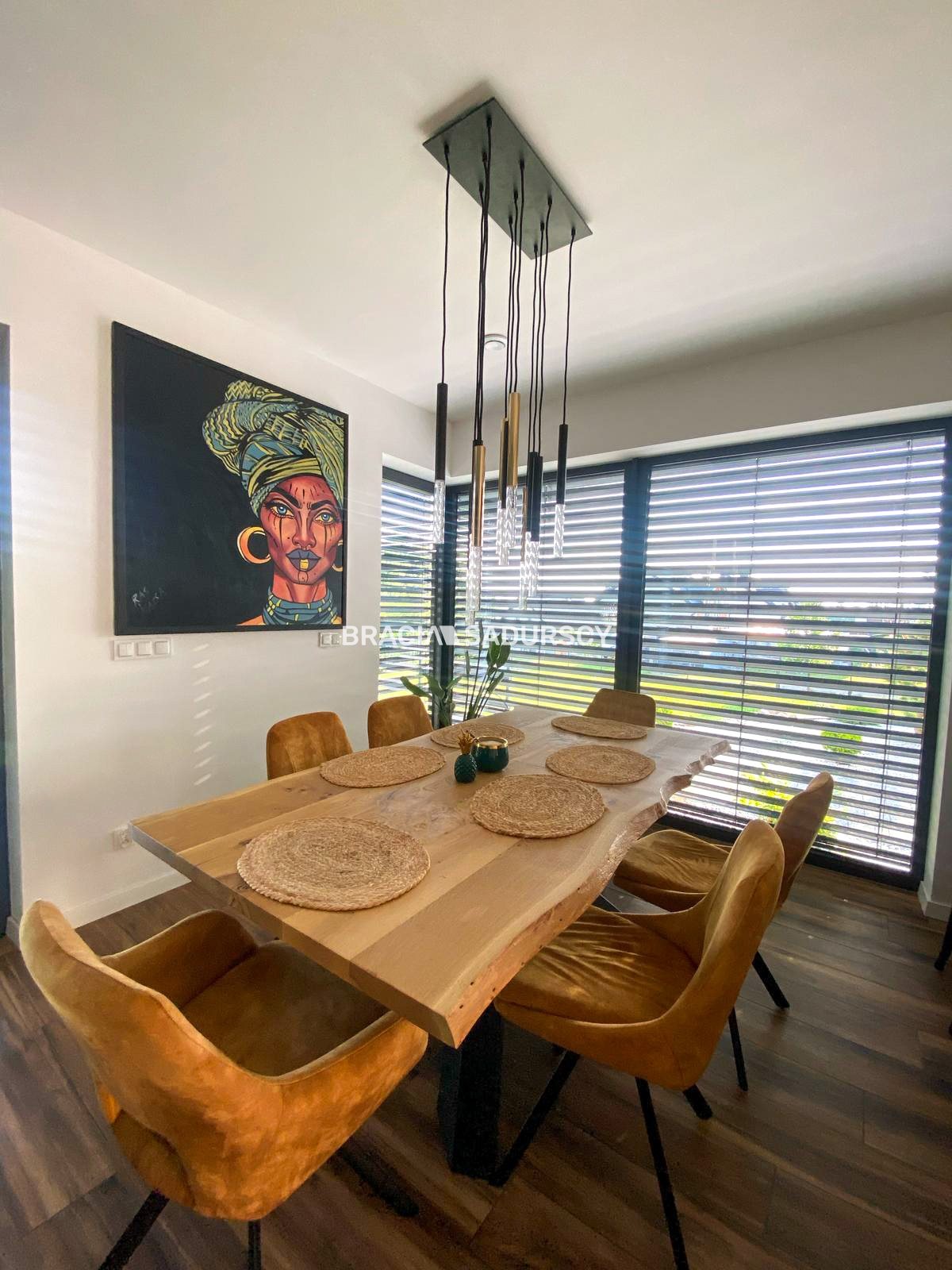 Dom posadowiony na działce ma powierzchnie 105 m2, powstał w 2024 roku i składa się z dwóch kondygnacj i. Na parterze znajduje się otwarta kuchnia, salon z dużymi przeszkleniami, toaleta, korytarz oraz kotłownia. Na piętrze są trzy sypialnie oraz duża łazienka z wanną i prysznicem . Dom jest bardzo przytulny, jednocześnie nowoczesny i ponadczasowy. Minimalistyczne oświetlenie, duże przeszklenia, luksusowe meble, eleganckie, drewniane podłogi oraz elementy dekoracyjne nadają mu ekskluzywnego charakteru. Dodatkowymi udogodnieniami są elektryczne rolety zewnętrzne, ogrzewanie podłogowe w całym domu, klimatyzacja oraz rekuperacja. Z salonu na piękny ogród prowadzi duży, drewniany taras.