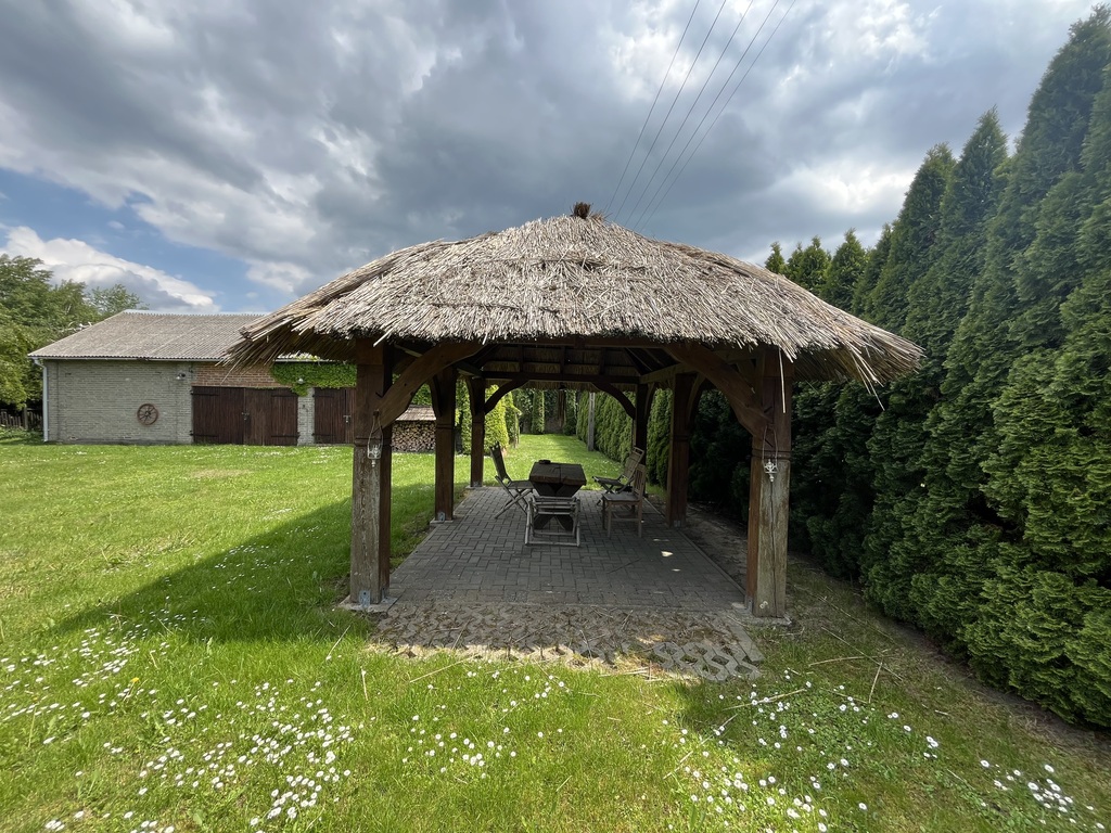-na posesji oprócz domu znajduje się drewniana altana o pow. 14 m2 pokryta trzciną oraz murowana z czerwonej cegły stodoła o wymiarach 8 m x 16 m. Duży budynek składający się z dwóch oddzielnych pomieszczeń o wymiarach 6 m x 6 m oraz 11,5 m x 6,8 m. Budynek idealnie nadaje się do zaadoptowania nawet na cele mieszkaniowe.