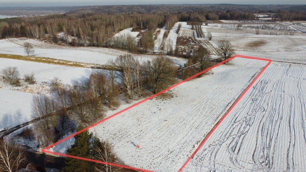 - działka lekko nachylona w dół patrząc od strony drogi z pięknym widokiem na tereny przyległe.