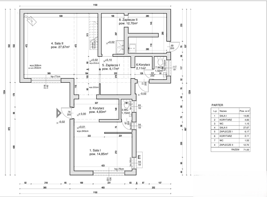 -w budynku na parterze znajdują się: dwa korytarze o pow. 4,83 m2 i 2,11 m2 dwie sale dla gości (klientów)o pow. 14,85 m2 i 27,67 m2, dwa pomieszczenia (zaplecza, kuchnia) o pow. 6,17 m2 i 12,70 m2 oraz dwa WC (dla obsługi i gości) o pow. 1,15 m2 i 1,52 m2. Na strychu na który prowadzą schody znajduje się dodatkowe pomieszczenia (sala dla gości) o pow. 17,40 m2