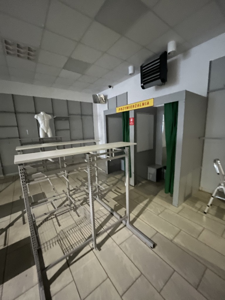 -na hali znajduje się lada sprzedażowa, dwie przymierzalnie, lustra, oświetlenie punktowe.