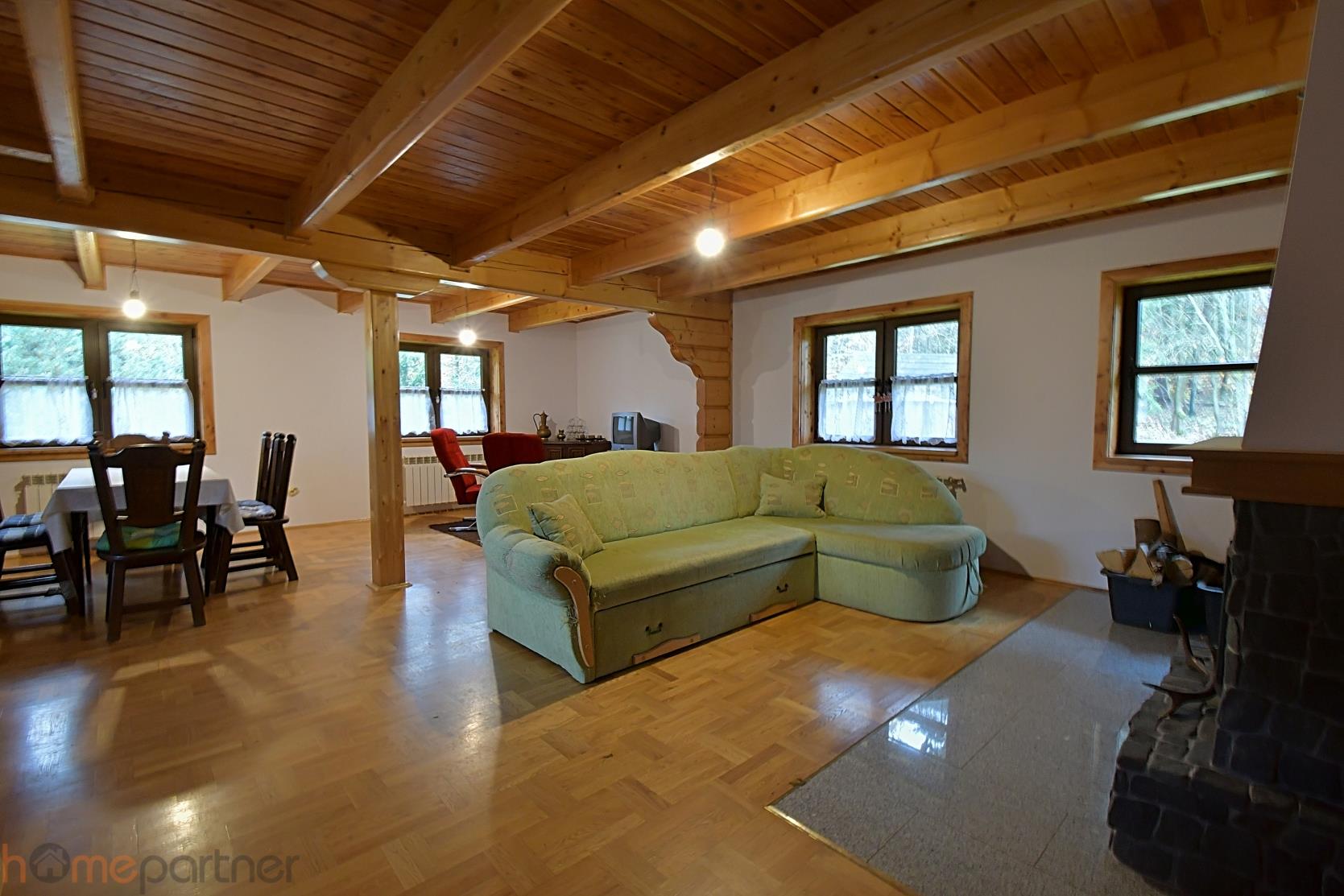<b>Materiał wykonania: </b>Budynek mieszkalny wybudowany w latach 2002-2003 roku przez zakopiańskich cieśli z bali z drewna leżakowanego 2 lata. Jest on docieplony wełną mineralną 15 cm, z kamienną podmurówką, dach pokryty modrzewiowymi gontami drewnianymi, rynna zakopiańska, stolarka okienna pcv dwuszybowa, okna antywłamaniowe, stolarka drzwiowa drewniana.