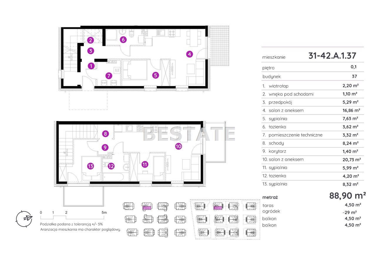 BESTATE Nieruchomości Wrocław oferuje do sprzedaży jednopiętrowy, pięciopokojowy mieszkania/ domy w stanie deweloperskim, w zabudowie szeregowej, o powierzchni 88,90 m.kw. + taras o pow. 4,50 m.kw. oraz 2 balkony- po 4,50 m.kw. każdy.