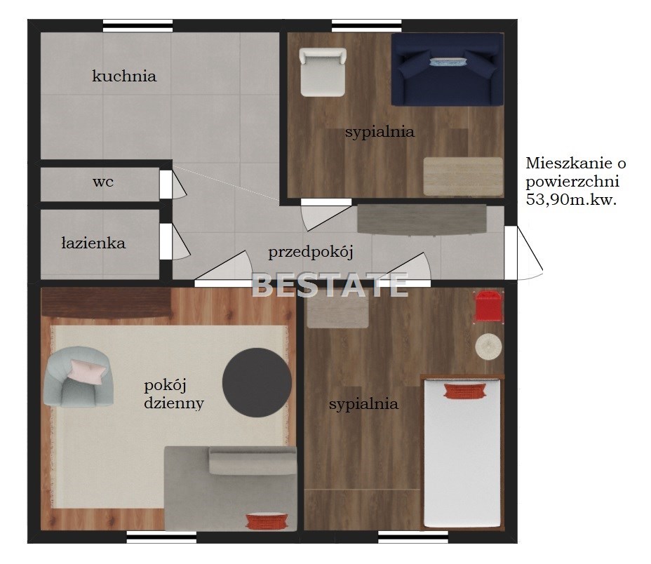 pokoju dziennego o pow. ok. 15,6 m.kw., dwóch pokoi/sypialni o pow. ok. 11,20 m.kw i 9,70 m.kw, kuchni o pow. 6,20 m.kw., łazienki o pow. 5,70 m.kw., wc o pow. 1,10 m.kw i przedpokoju o pow. 4,40 m.kw.