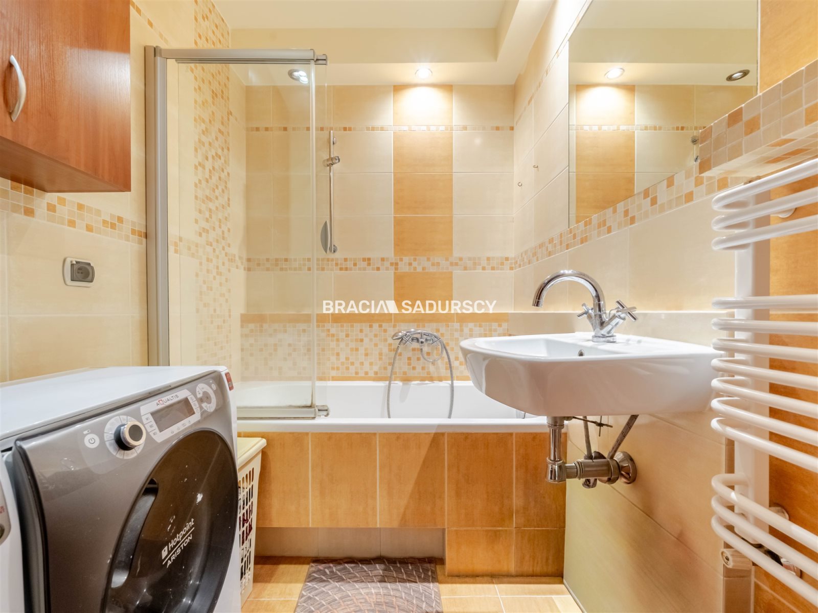 Łazienka w ponadczasowej, ciepłej kolorystyce.