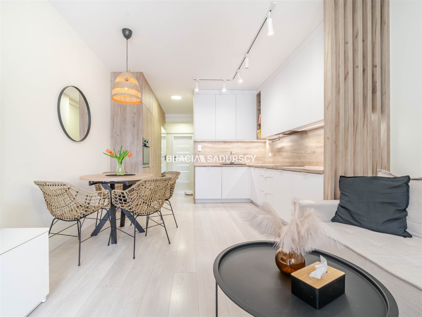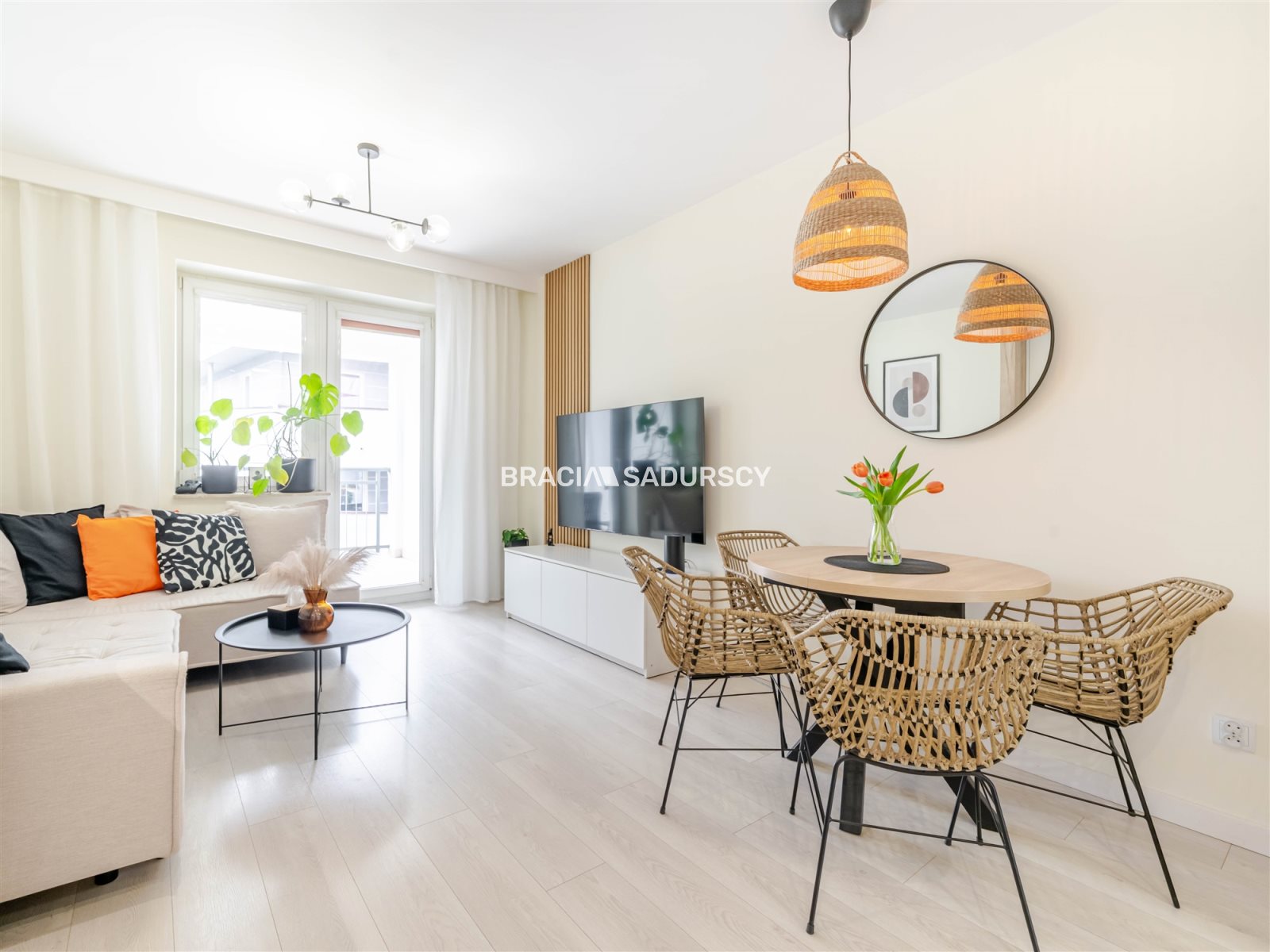 Salon z aneksem kuchennym i wyjściem na duży balkon