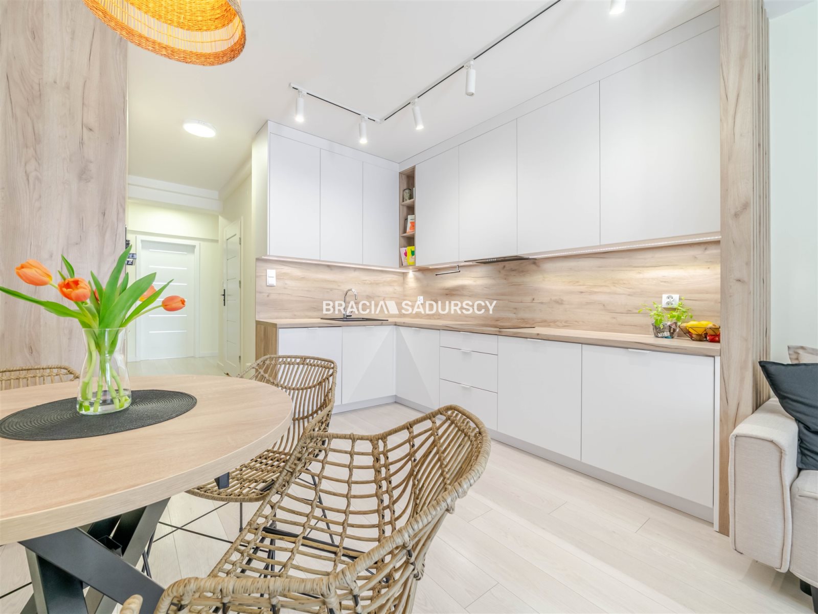 Kuchnia oraz zabudowy meblowe zostały wykonane na wymiar - z wysokiej jakości materiałów, co gwarantuje wygodę i trwałość.