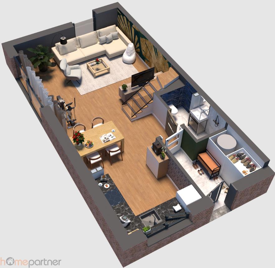 Parter: dobrze doświetlony salon z aneksem kuchennym oraz jadalnią, łazienka z prysznicem, wiatrołap z miejscem do przechowywania, miejsce pod zabudowę szaf