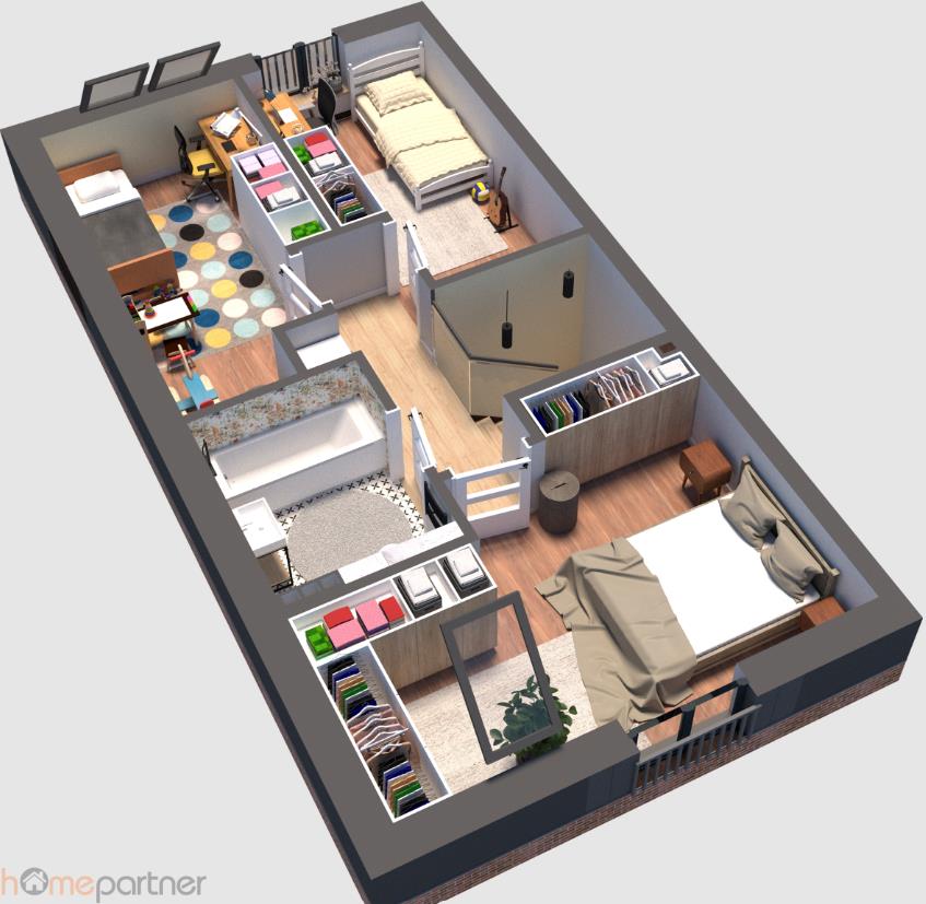 I piętro: trzy ustawne sypialnie, sypialnia główna z wyodrębnionym miejscem na garderobę, łazienka z wanną oraz poddasze nieużytkowe - wejście za pomocą schodów składanych