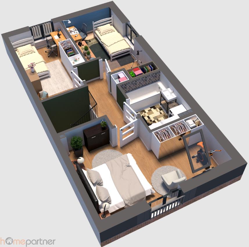 I piętro: trzy ustawne sypialnie, sypialnia główna z wyodrębnionym miejscem na garderobę, łazienka z wanną oraz poddasze nieużytkowe - wejście za pomocą schodów składanych
