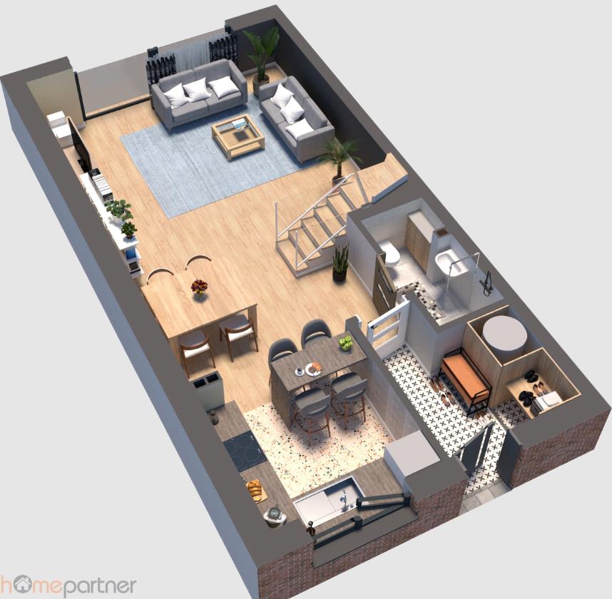 Parter: dobrze doświetlony salon z aneksem kuchennym oraz jadalnią, łazienka z prysznicem, wiatrołap z miejscem do przechowywania, miejsce pod zabudowę szaf