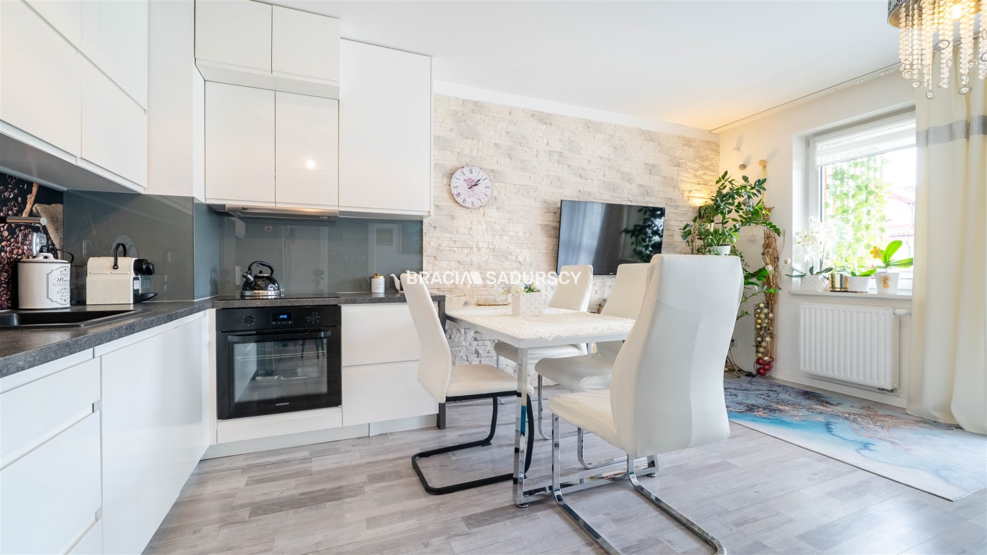 Kuchnia w pełni umeblowana i wyposażona w sprzęt AGD.