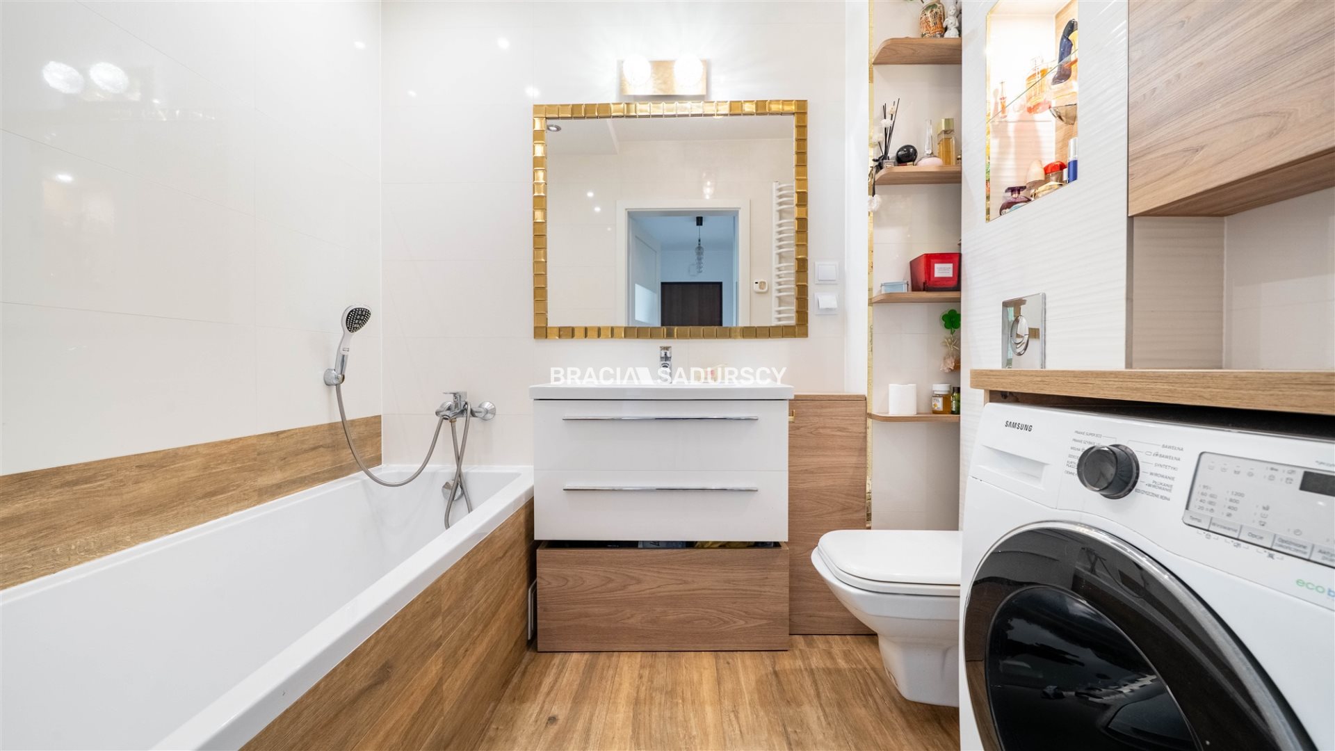 Na podłodze panele a w łazience terakota.