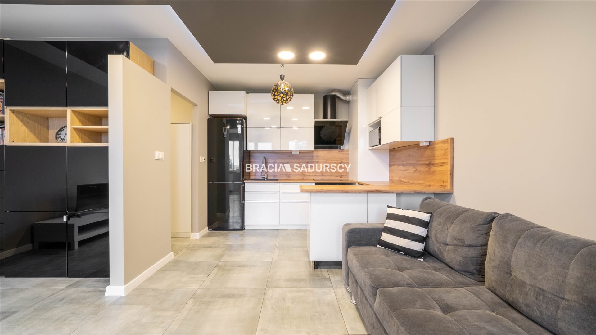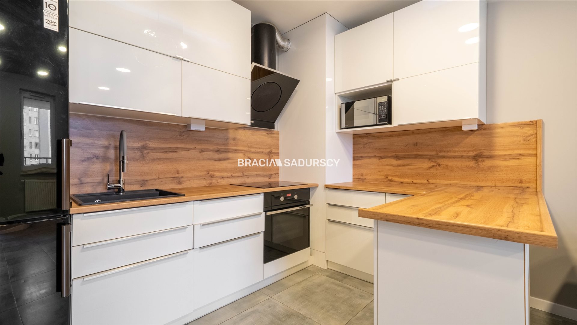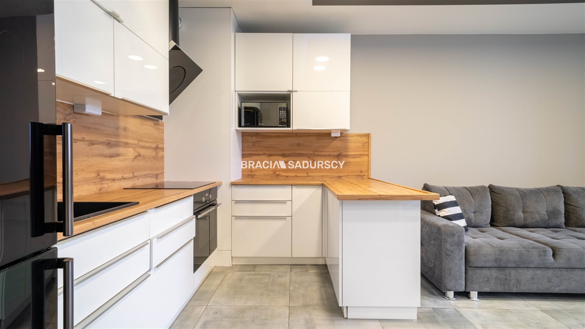 W łazience znajduje się prysznic bez brodzikowy, a kuchnia ma meble robione na wymiar.