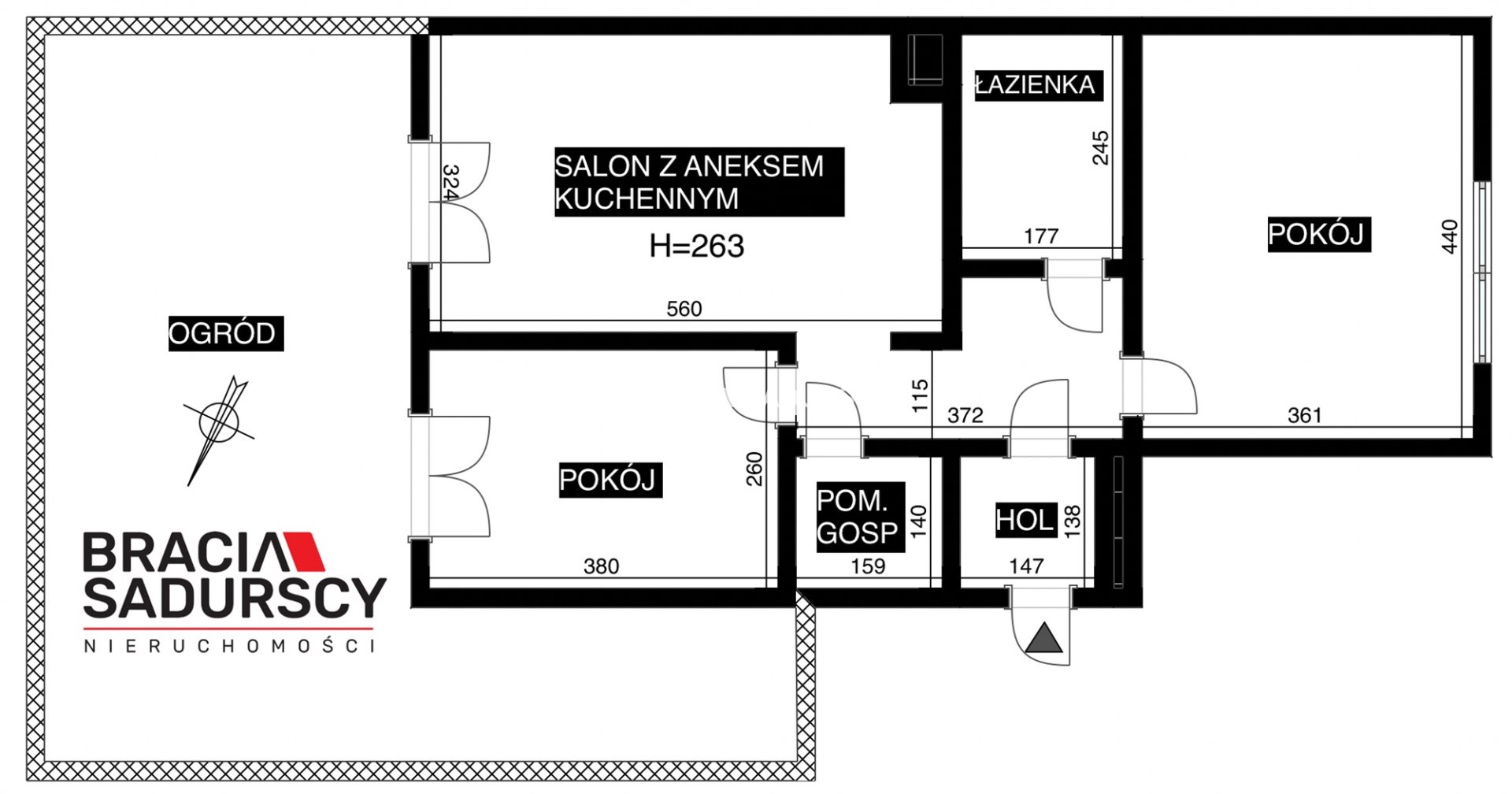 3 pokoje: salon z aneksem kuchennym + 2 sypialnie,