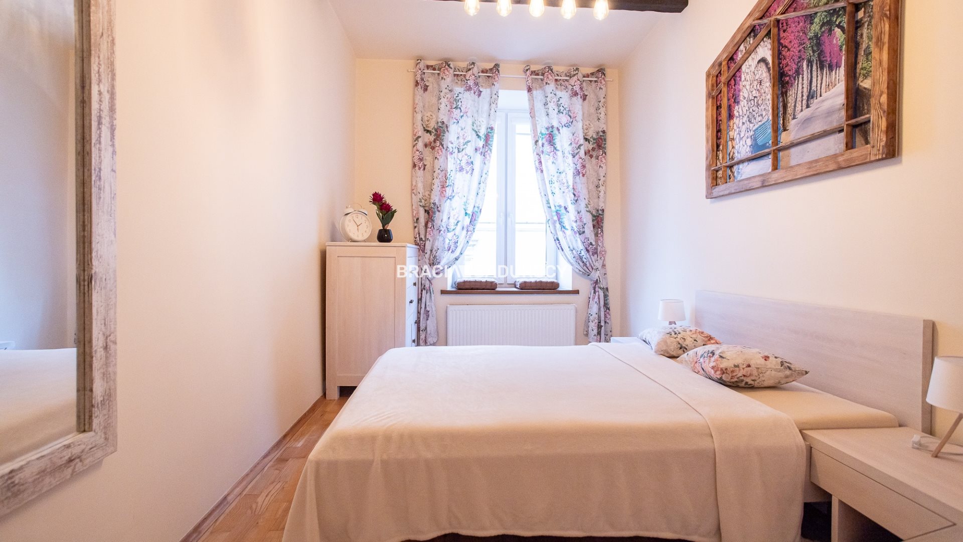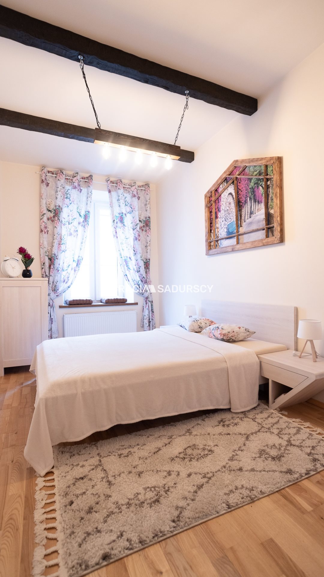Mniejszy pokój wykończony w stylu prowansalskim, zakupiono do niego drewniane meble z drewna brzozowego; duży pokój wykończony modernistycznie, w stylu kolejowym (fototapeta, meble drewniane seria Railway- drewno mango). Mieszkanie wykończone i wyposażone jak na zdjęciach. Widok z obu pokoi jest na ul. Nową, szerokie parapety sprawiają że w ładne dni można relaksować się siedząc z kawą i książką, czując klimat Kazimierza.