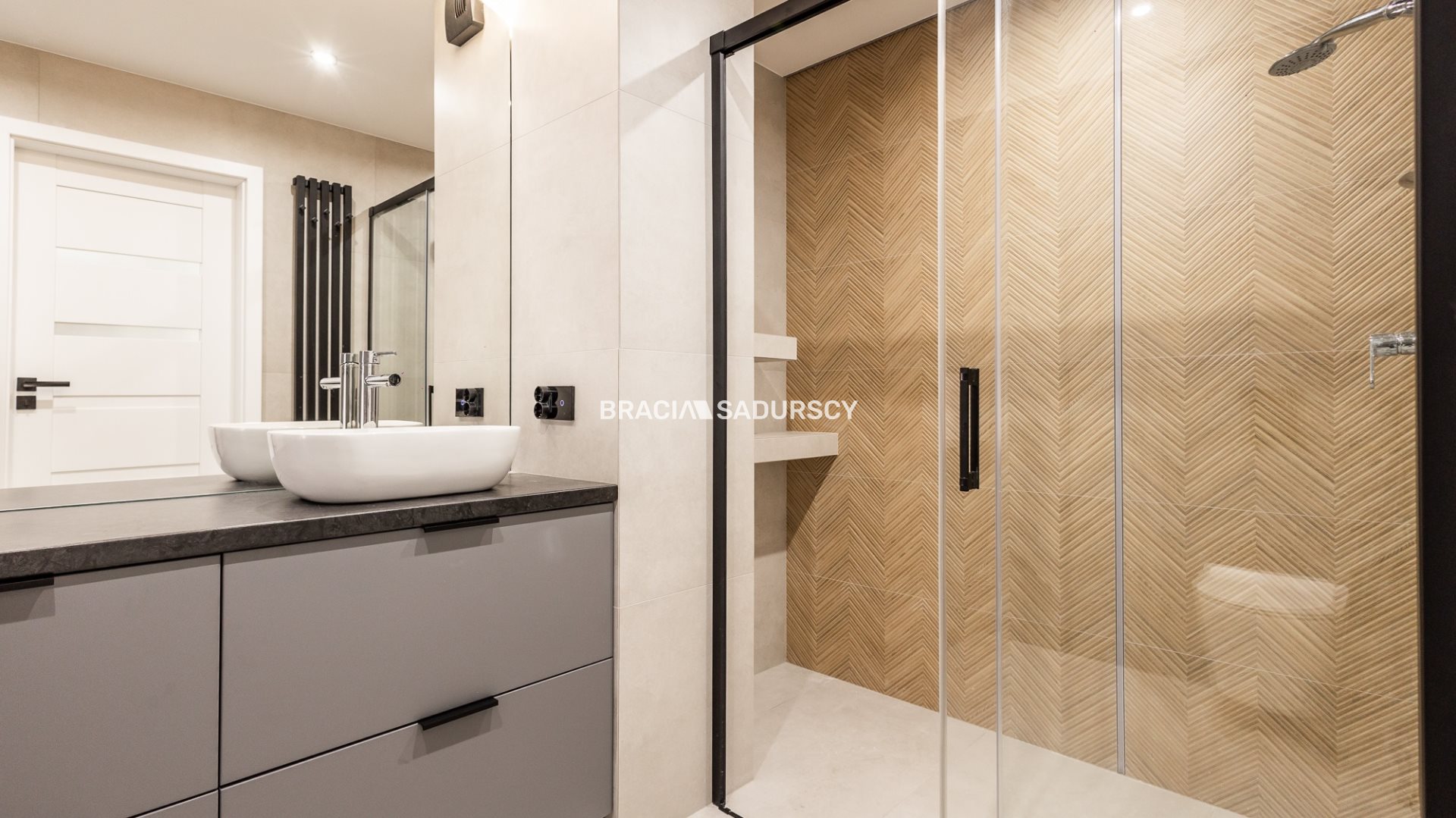 Łazienka - nowoczesne wykończenie, przestronna kabina prysznicowa lub wanna.